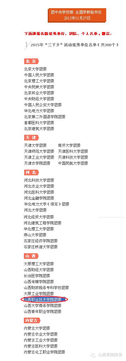 为促进“三下乡”活动持续深入开展,在青年学生思想政治引领特别是实践育人工作中发挥更加积极的作用,经过各省级团委学校部遴选推荐、网络平台公开投票、差额评审确定等环节,团中央学校部、全国学联秘书处决定对在2015年“三下乡”活动中表现突出的北京大学团委等 300个单位、清华大学赴四川省甘孜州雅江县新卫村村小搭建微型电网支队等400支团队、中国人民大学团委副书记李健希等200名个人给予通报表扬。