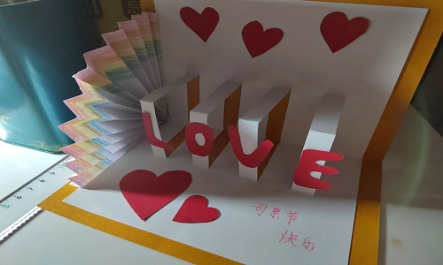 车辆工程系新能源A2101班高雅蓉同学制作的母亲节贺卡,以一个立体的love和五个红色爱心呈现在我们眼中,简朴却不失对母亲的浓浓爱意,适应了活动主题创作新奇,富含深意。