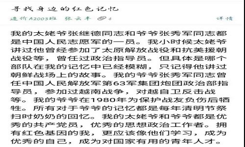 我们特将该同学太姥爷和爷爷的事迹推送到建筑工程系公众号上,向广大师生宣扬红色事迹,让大家重温红色记忆,并继续传承爱国主义,从而给我们当代青年提供一种动力和精神支撑,激励我们孜孜不倦的努力学习和认真工作。