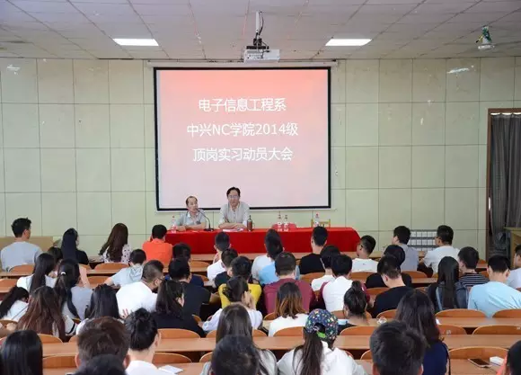 为响应学校人才培养方案要求,6月17日,电子信息工程系在信息工程学院办公楼四层会议室召开了中兴NC学院2014级顶岗实习动员大会。会议由中兴NC学院白慧斌院长主持召开,学管秘书王跃红、2014级专职辅导员任秀丽老师以及2014级实习学生参加了本次动员大会。系书记程革参加了会议并讲话。