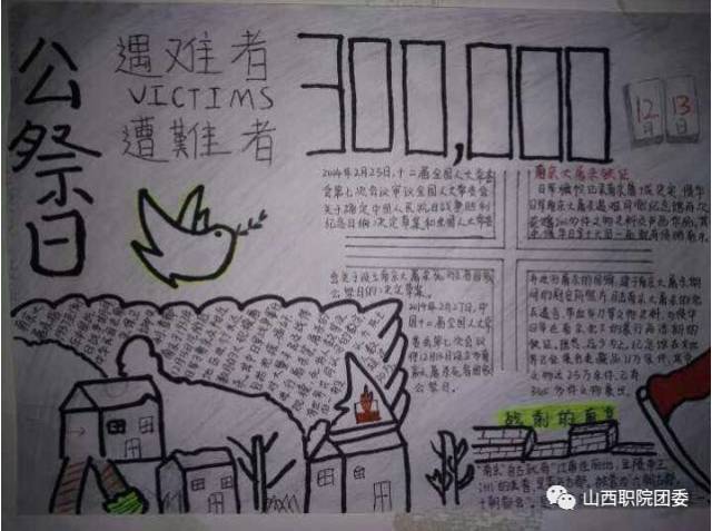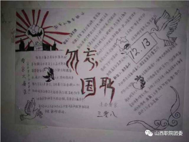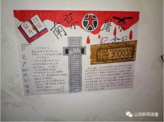 为了解“南京大屠杀国家公祭日的时间、意义,激发学生的爱国激情,也为了纪念一九三七年惨绝人寰的南京大屠杀,会计系于十二月十三日举办了以“永铭国耻 振兴中华”为主题的手抄报活动。