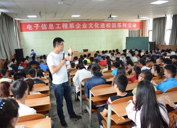 为了促进学生深入了解企业、了解经济发展对人才的需求变化趋势,教育引导大学生认清形势、转变观念、不断提升就业创业意识。电子系于2016年5月27下午在信息工程学院办公楼4层阶梯教室开展“关注企业文化,展望未来之路”校园主题讲座活动。