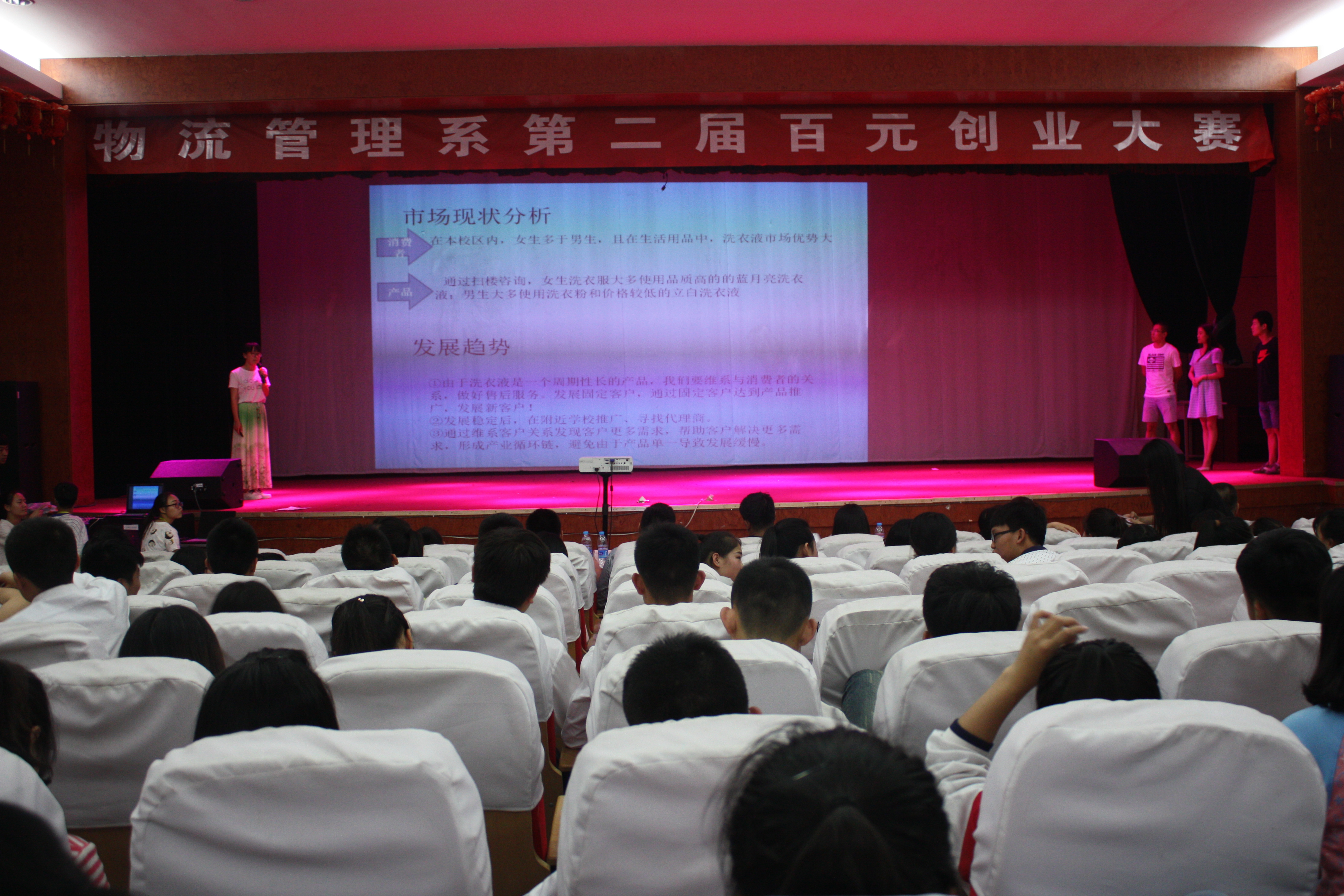 为引导大学生树立创新意识,培育创新精神,提高创业本领,增强创业意识。4月25日至5月20日,物流管理系举办了以“创业梦想Style,你敢来“踹”(Try)么?”为主题的百元创业大赛。正式比赛共一个月时间,各队颁发100元现金,可以以各种形式在校内及学院周边进行推销,取得盈利;比赛结束后各队若手中剩余现金大于等于100元需交出赛前所颁发的100元创业基金,剩余资金及物资归各队所有。若各队出现亏损情况,创业基金100元凑齐归还。通过各队所有队员们的努力,最终由营销A1402班的张宇、毕丽莎、高艳、白玉娇、王宗玉组织的西瓜蜜团队获得了本次大赛的第一名。通过此次活动,让同学们体会到创业的辛酸和困难,以及收获的喜悦,同时提高同学们的各种应变能力,提供给同学们一个理论和实践相结合的平台,让大家在实践中共同进步。
