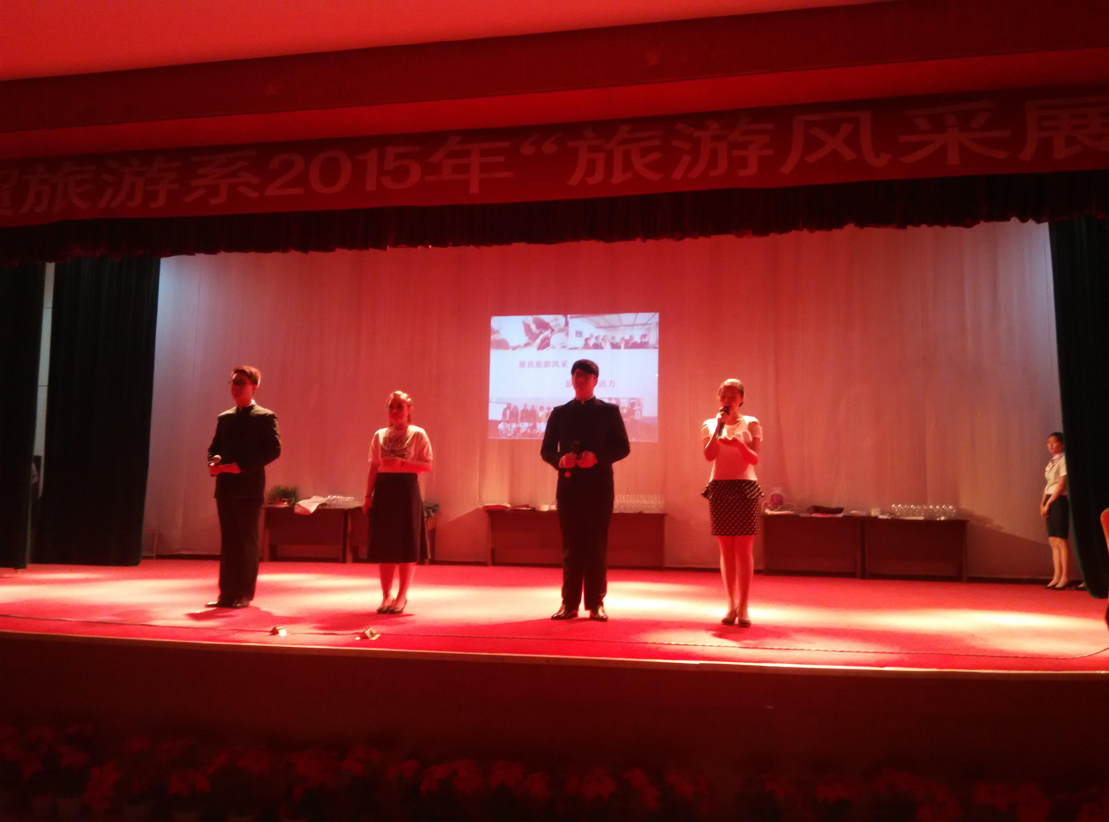 2015年5月13日晚19时,我商贸旅游系在校礼堂举行了“商贸旅游系旅游风采展演活动”。本次演出主要响应我校“校园文化节”的系部展出活动,参与演出的人员主要由在刚结束的“第九届高职杯技能大赛”中取得优异成绩的同学们组成,代表展示我商贸旅游系魅力风采。