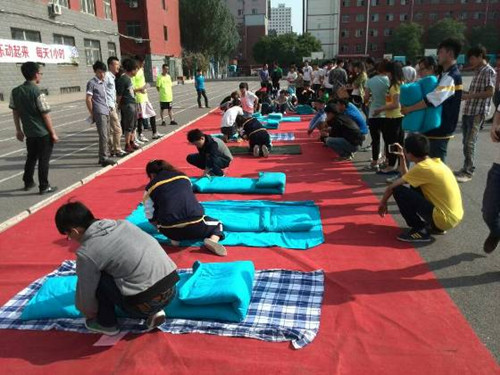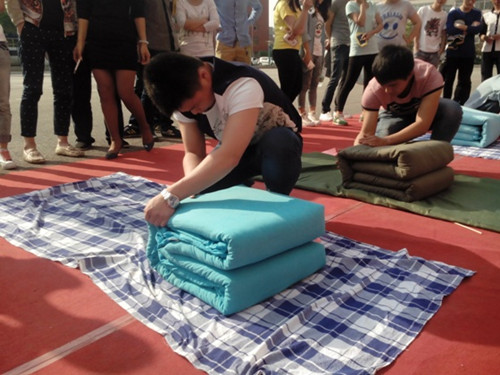 为进一步规范同学们的内务卫生,培养同学们的良好习惯,同时结合我系的团组织进公寓和星级宿舍评比活动,2014年4月29日下午建筑工程系学生会生活部在学院操场举办了建工系首届叠军被大赛决赛。本次活动以宿舍为单位,各宿舍选派两名选手参加初赛,经过初赛选拔,28名选手进入了决赛,一声哨声,参赛选手开始忙碌起来,手脚利落的摊开被子进行折叠,加上平时的刻苦锻炼,军被在选手们的手中很快地变成四四方方的“豆腐块”,各位评委仔细观察,认真打分。最终,4号公寓338宿舍的朱一杰获得了此次大赛第一名,1号公寓113宿舍的郝锐、2号公寓405宿舍的安欣怡获得了第二名,3号公寓407宿舍的张彤、4号公寓312宿舍的牛彩霞、2号公寓303宿舍的白兆斌获得了第三名。