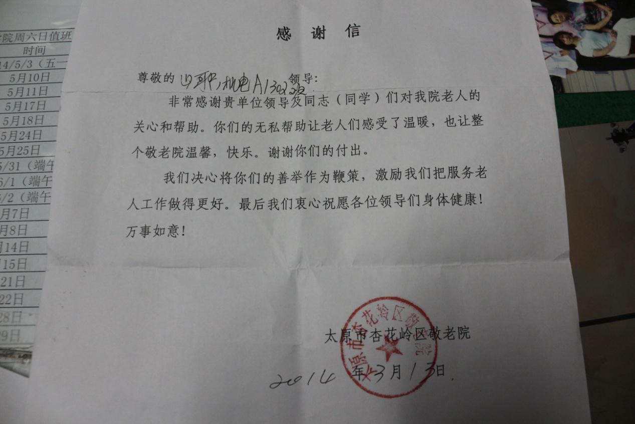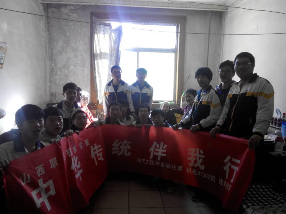 为增加班级凝聚力,增强同学们的奉献精神,2014年3月13日,自动化系机电A1302班学生带着相关的慰问物品来到了太原市杏花岭区敬老院进行慰问。同学们有的为敬老院打扫卫生,有的陪老人们聊天,大家忙的不亦乐乎,老人们的脸上也都不时地带着笑容。最后,敬老院院长致感谢信感谢同学们对敬老院老人的关心和帮助。