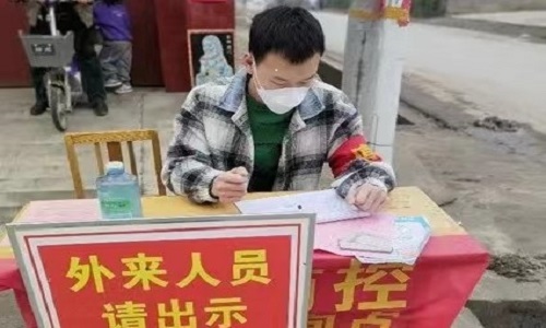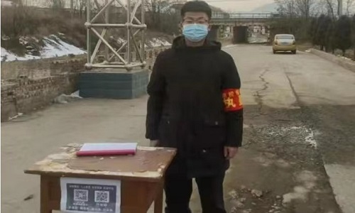 他的工作主要是在村镇路口及街道口执勤、测量来往人员体温并做好登记信息。