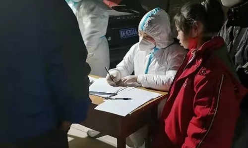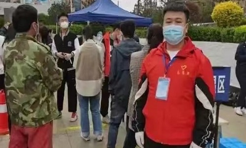 在志愿活动中,车宏伟同学的工作是:测量核酸检测人员体温、登记人员信息、维持现场秩序。