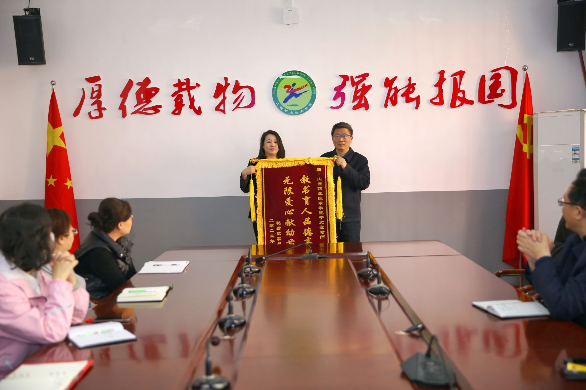 会上,尤陶江代表学院对于文金同志提出表扬并受家长委托授予锦旗,他指出:近日,习近平总书记对深入开展学雷锋活动作出了重要指示。习近平总书记强调,新征程上,要深刻把握雷锋精神的时代内涵,要发挥好党员、干部模范的带头作用,让学雷锋活动融入日常、化作经常,让雷锋精神在新时代绽放更加璀璨的光芒。他强调,一是我们要进一步深入贯彻落实习近平总书记的重要讲话精神,进一步大力弘扬雷锋精神,以于文金同志长期以来热心助人的事迹为榜样,推动学院学雷锋活动常态化,倡导时代新风正气,培育师生们践行社会主义核心价值观,凝聚开云官网师生的正能量。二是文金同志十年如一日的默默宣扬着雷锋精神,她不计报酬、不遗余力的通过“从自身做起,从平凡的小事做起”的方式表达了自己对雷锋精神的延续。她将雷锋精神渗透在血液里,贯彻在行动中,体现在日常生活中,非常难能可贵。我们要把于文金同志的事迹作为宣传典型,大力弘扬并开展好宣传工作,让雷锋精神在山职院落地生根。