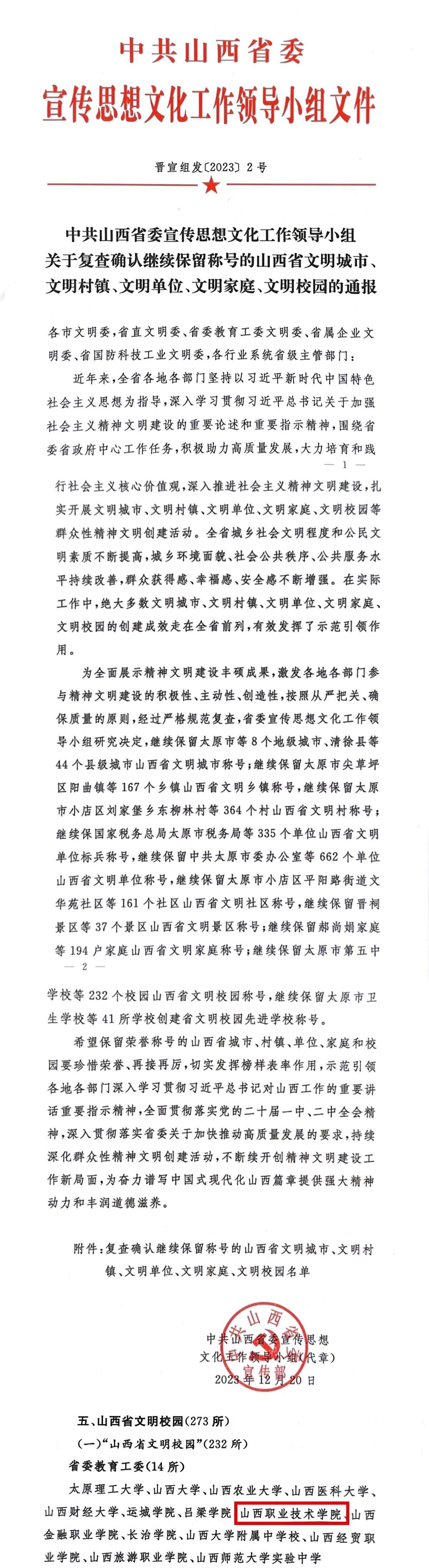 近期,中共山西省委宣传思想文化工作领导小组印发《关于命名2020-2022年度山西省文明城市、文明村镇、文明单位、文明家庭、文明校园的决定》,对2022年度全省涌现出的成绩突出、影响广泛的先进典型进行表彰,开云官网被授予2020-2022年度“山西省文明校园”称号。