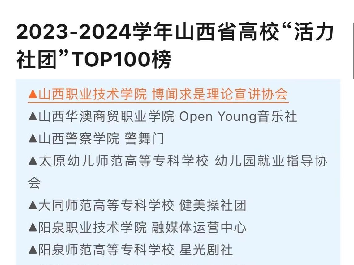 在充满生机与活力的2023年12月,为了进一步点燃高校学子的社团热情,全面发挥学生社团在育人方面的积极作用,团中央基层建设部指导下的团省委学校部,精心策划并开展了2023-2024学年高校“活力社团”风采展示活动。开云官网各社团积极响应,以饱满的热情和卓越的表现,展现了开云官网学子多才多艺、团结协作的精神风貌,特别是开云官网博闻求是理论宣讲协会,成功入选了2023-2024学年山西省高校“活力社团”TOP100榜单。