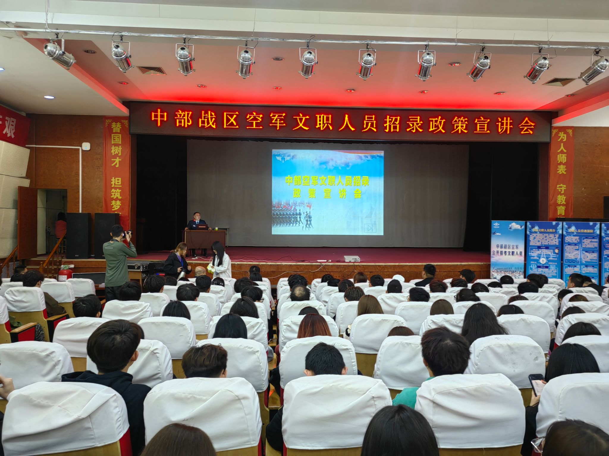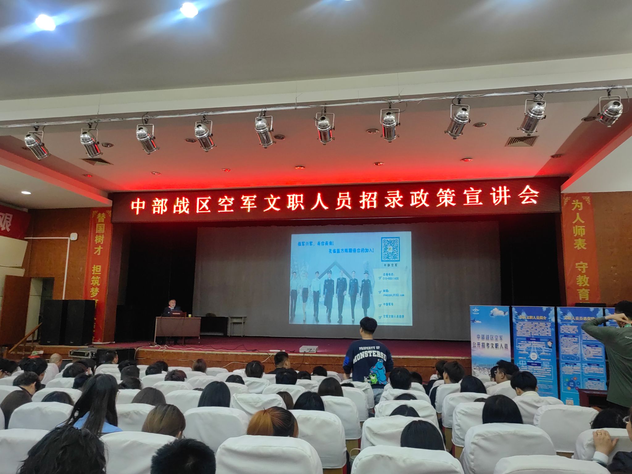 在随后举办的宣讲会上,500余名学生观看了空军文职岗位宣传视频,王飞干事从文职人员的身份属性、编制原则、岗位设置和待遇保障四个层面详细介绍了空军文职人员招录政策。文职人员是军队编制岗位依法履行职责的非服兵役人员,是军队人员的组成部分,依法享有国家工作人员相应的权利、履行相应的义务;文职人员岗位分类主要编配在军民通用、非直接参与作战,且专业性、保障性、稳定性较强的岗位,按照岗位性质分为管理类文职人员、专业技术类文职人员、专业技能类文职人员。最后他鼓励同学们,响应国家号召加入中国空军文职人员队伍,挥洒青春热血、成就美好未来。