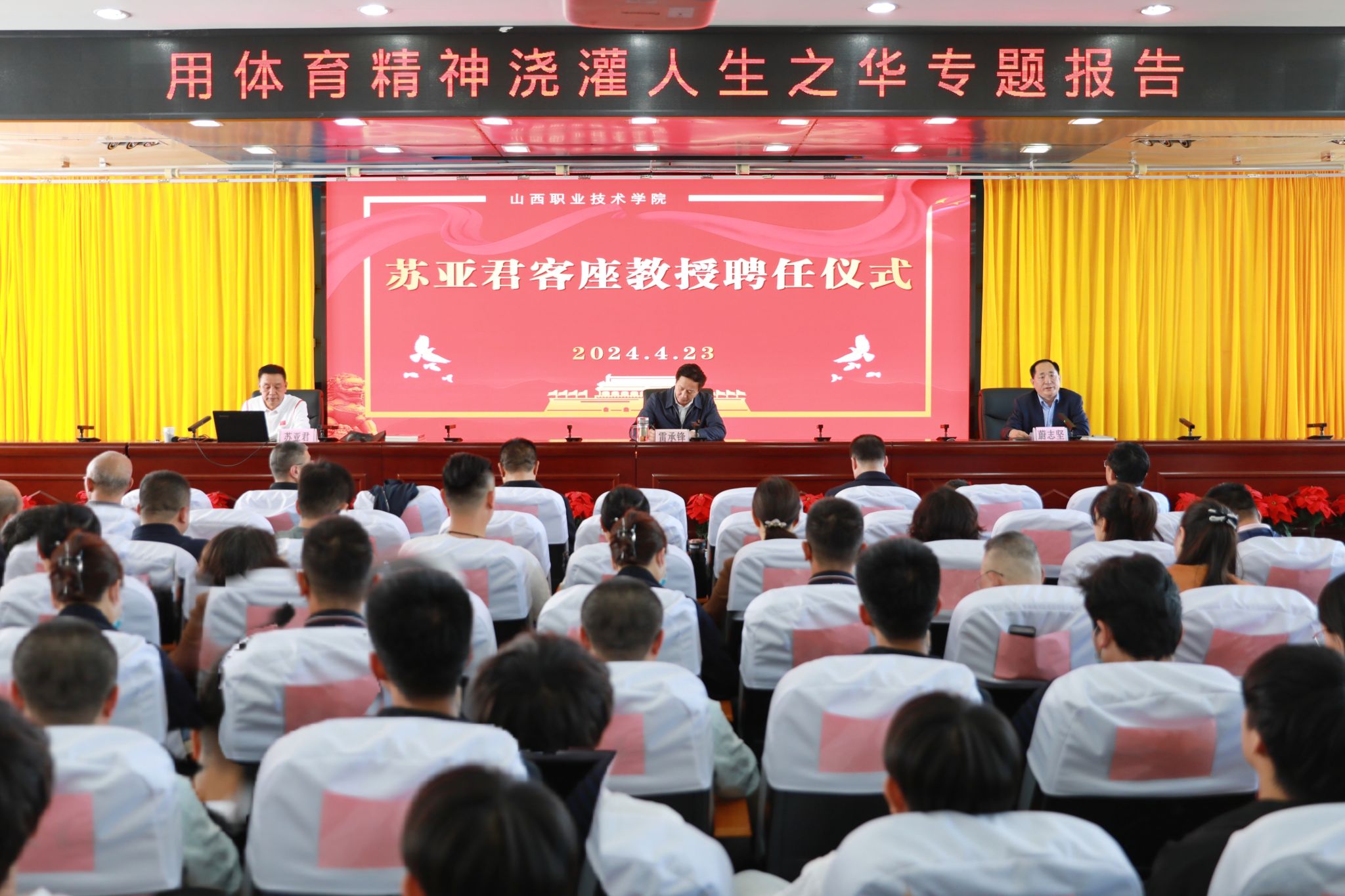4月23日下午3时,原山西省体育总会主席、山西省体育局原党组书记、局长苏亚君受开云官网邀请在坞城校区七楼会议室参加客座教授聘任仪式并做专题报告。党委书记雷承锋等全体院领导,学生工作部、团委、思想政治与理论教学研究部、体育教育部全体人员,各系部党总支书记、以及学生代表共同聆听了报告会。全院师生在线上参加报告会。报告会由党委委员、副院长蔚志坚主持。