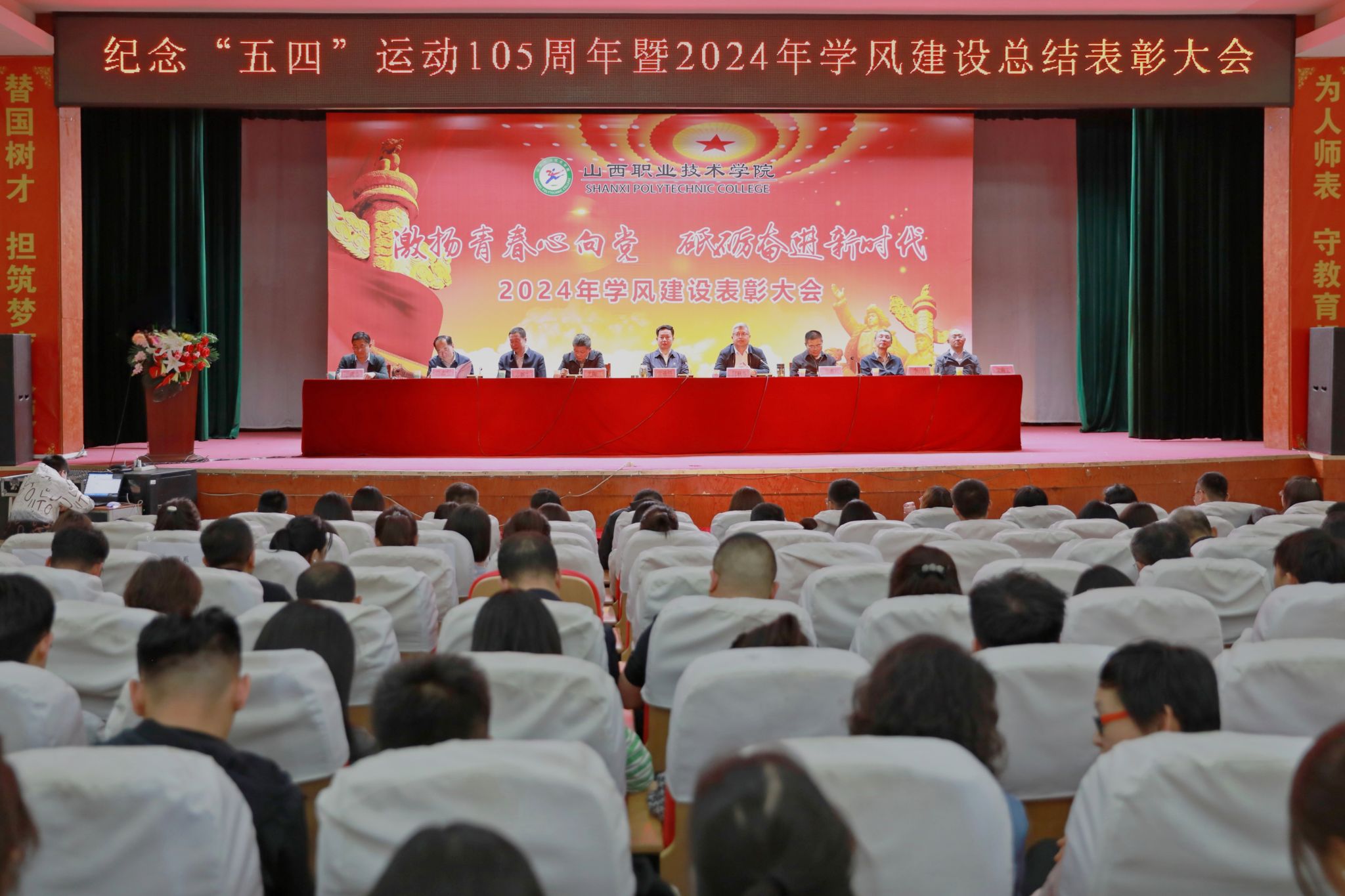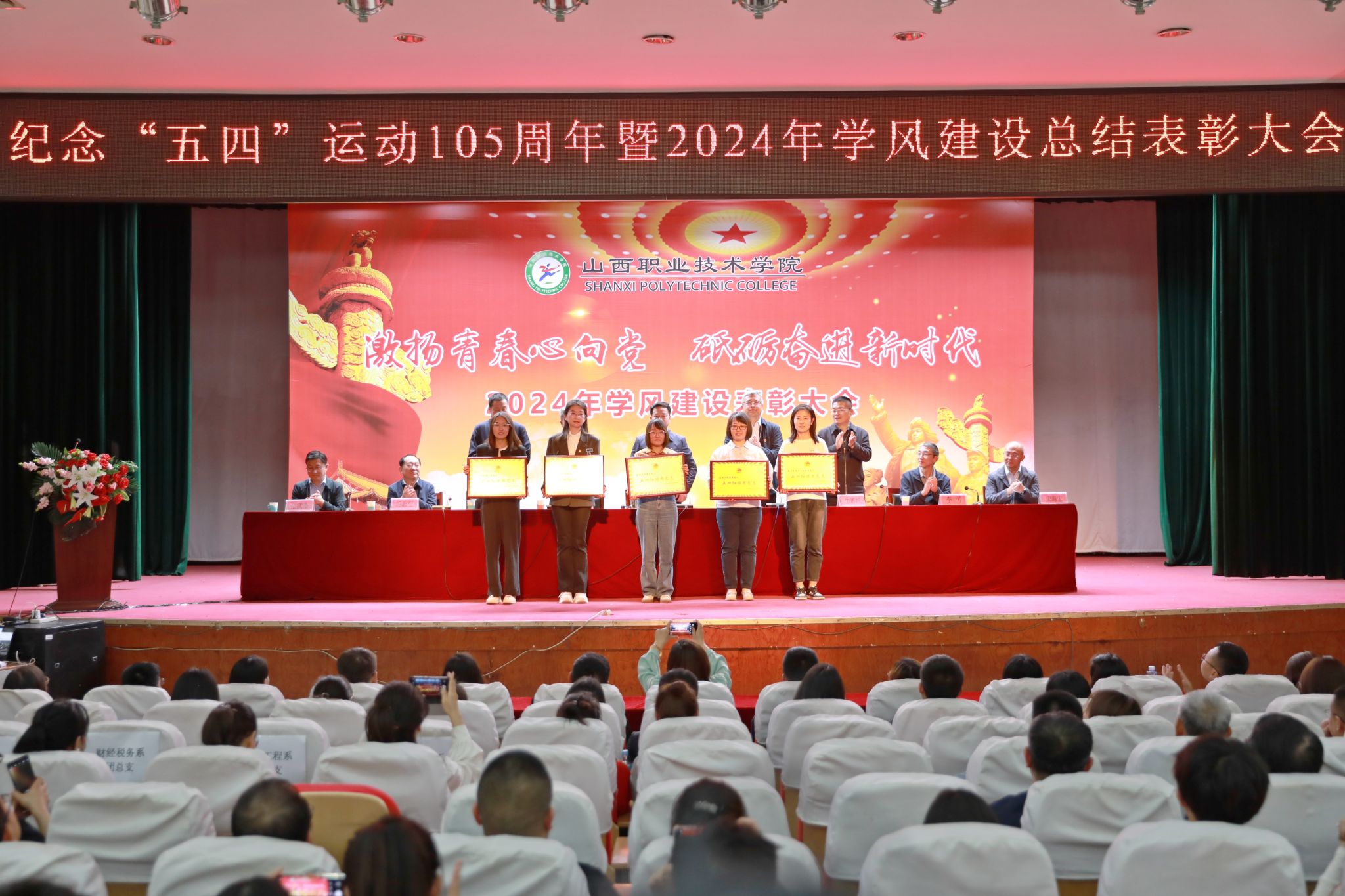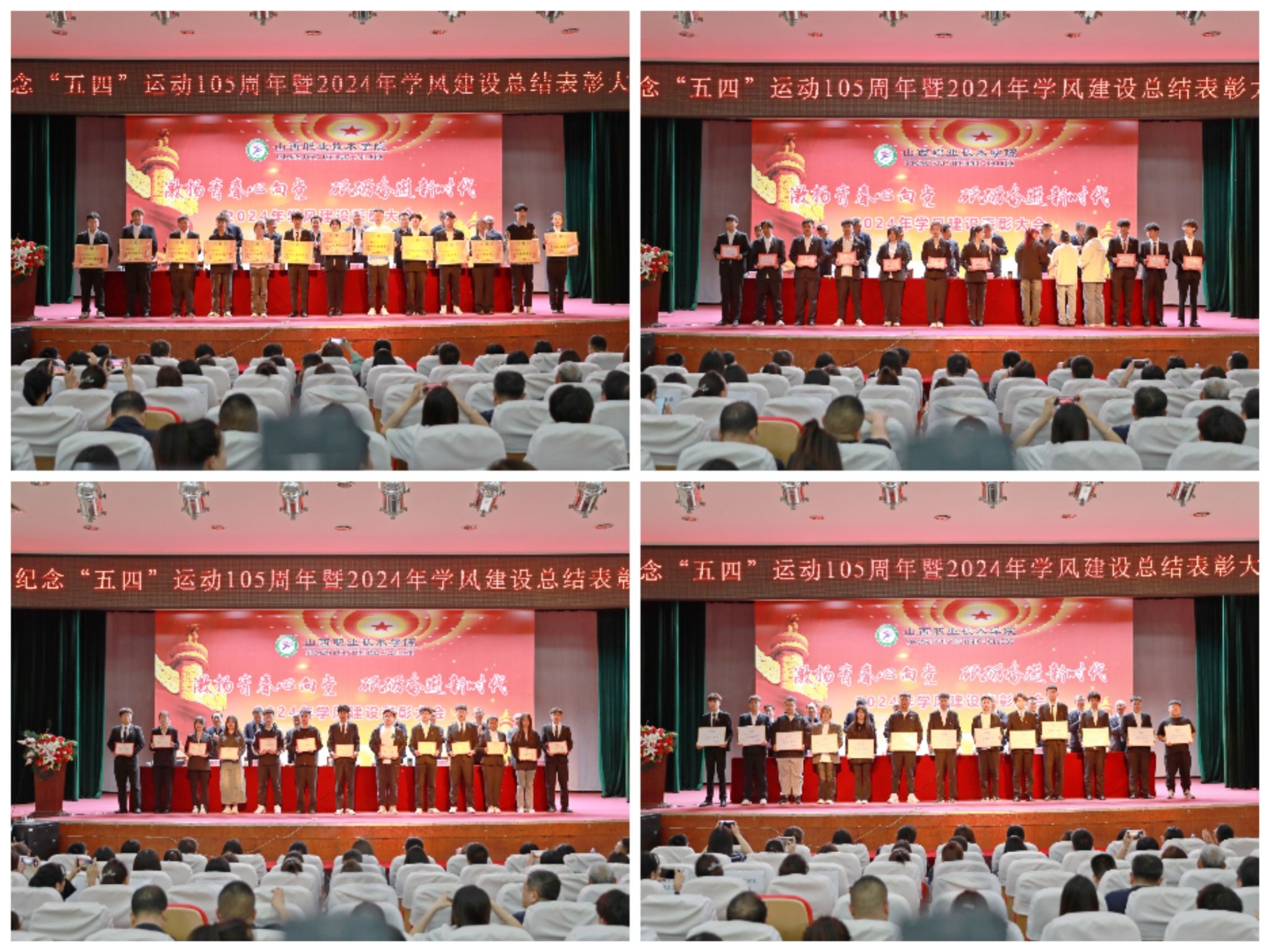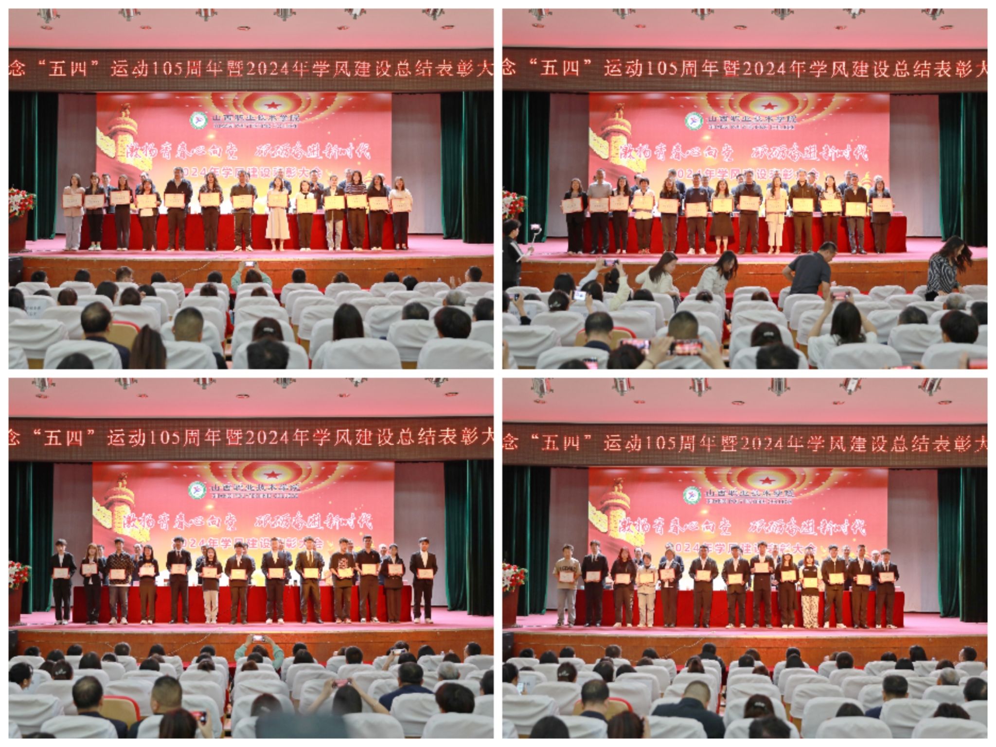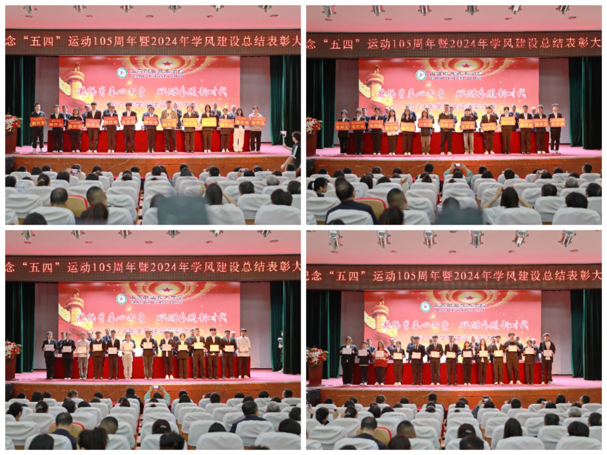 表彰大会在庄严的国歌声中拉开帷幕。赤新生从以立德树人为根本,加强思想政治引领;以阵地建设为依托,筑牢学风建设的坚强屏障;以持续凝练学院特色品牌,营造良好的校园文化氛围等三个方面就2023-2024学年学院学风建设取得的成果做了总结报告,并从以思想教育引领学风、以优良教风促进学风、以完善服务推动学风等三个方面对今后学院学风建设提出了具体要求。会议对荣获五四红旗团总支、优秀辅导员、优秀学生等12类奖项的集体和个人进行了表彰并颁发荣誉证书。获奖教师代表、学生代表分别进行了经验分享。