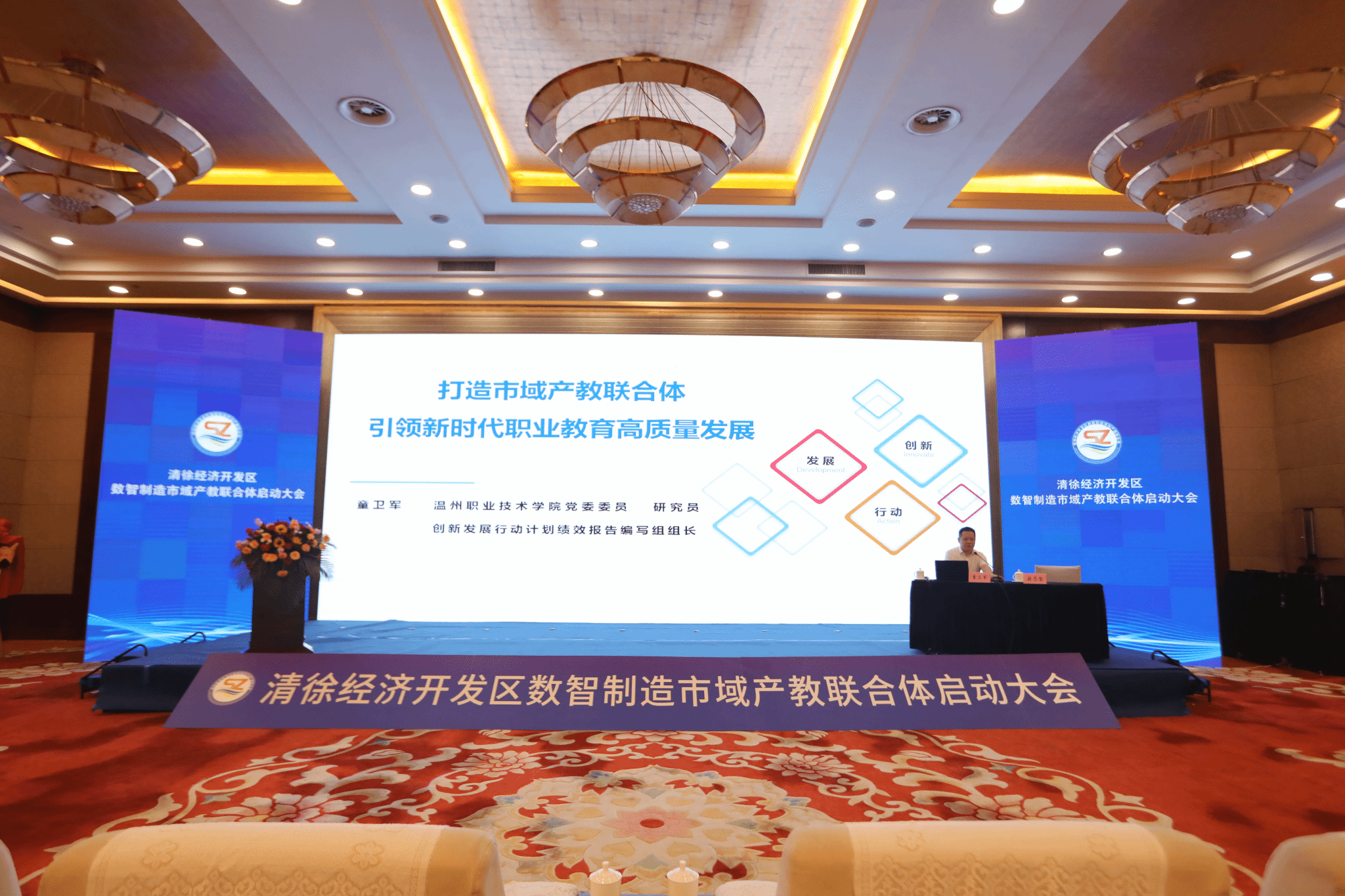 “联合体”启动仪式后,大会邀请温州职业技术学院党委委员、宣传部部长童卫军研究员做了“打造市域产教联合体 引领新时代职业教育高质量发展”的主题报告。童卫军从市域产教联合体的行动逻辑、实践探索、理论思考等多个维度深入阐释了“以教促产、以产助教、产教融合、产学合作”的职教改革方向,展示了如何通过务实高效的方式强化学校的服务定位,如何以利益增值为导向激发企业的参与热情,以及如何通过赋能发展来深化政府对职业教育的认同感。这一系列举措,不仅实现了学校、企业、政府三方共赢的局面,更为“扎根区域办大学”的理念提供了有力的支撑。
