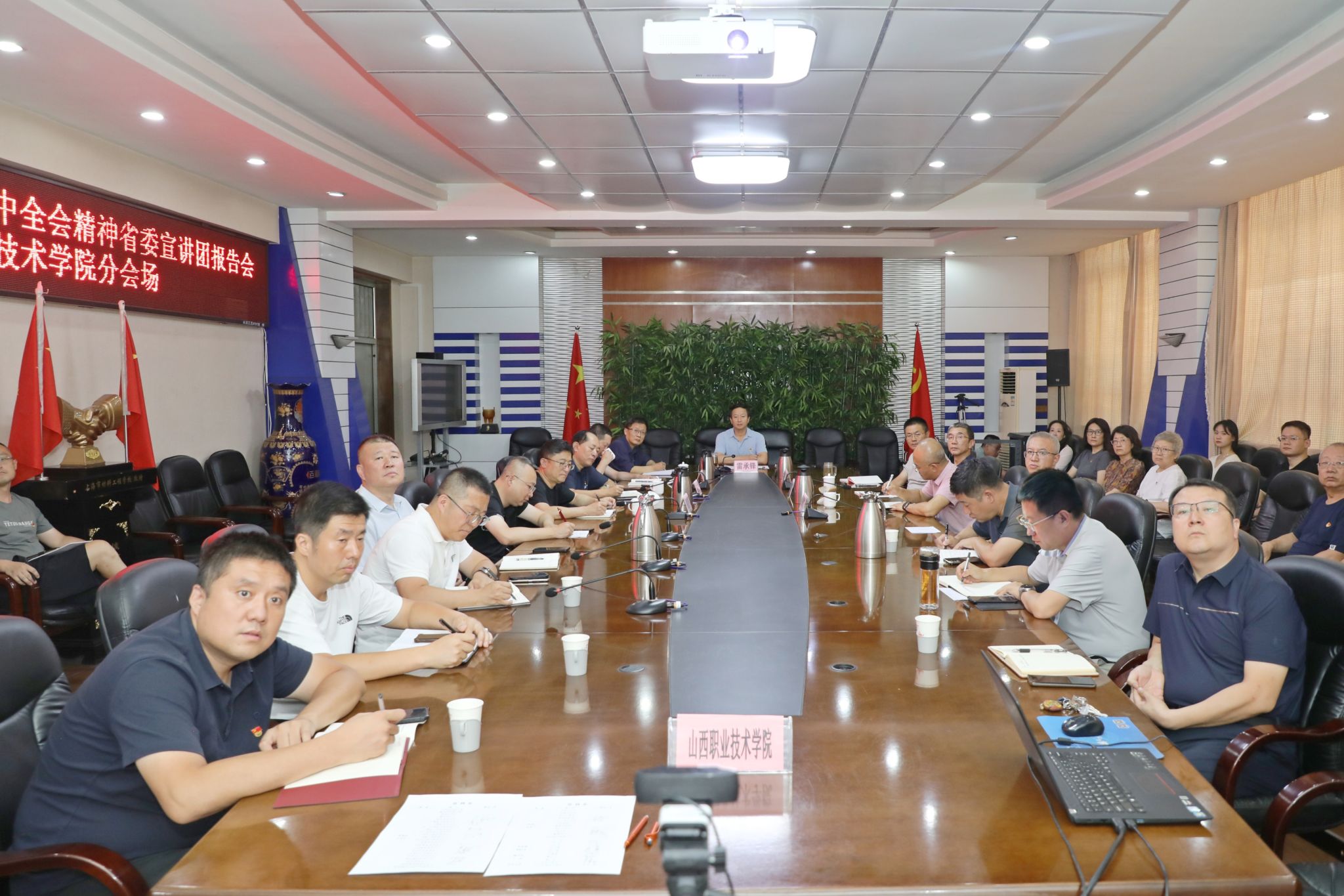 雷承锋要求,一是要深入学习领会全会精神,推动掀起学习贯彻热潮。全会审议通过了《中共中央关于进一步全面深化改革、推进中国式现代化的决定》,并对深化教育、科技、人才体制机制一体改革作出了重要部署。要深入领会学。坚持以习近平新时代中国特色社会主义思想和党的二十大精神为指导,自觉站在坚定捍卫“两个确立”、坚决做到“两个维护”的政治高度,认真学习贯彻党的二十届三中全会精神,深刻领会、准确把握精神实质和核心要义,充分认识全面深化改革的重要性和紧迫性,教育广大师生把思想和行动迅速统一到党中央的重大决策部署上来,切实将学习贯彻全会精神与学院各项事业发展和自身工作实际紧密结合起来,努力在育人体系、创新体系、治理体系等方面一体推进改革创新,不断提升服务区域发展和国家战略能力。要全面组织学。全院各级党组织要及时组织传达学习、周密安排部署、狠抓贯彻落实。各党总支、各部门要将学习贯彻全会精神和宣讲报告会精神作为第一议题迅速组织传达学习,要通过召开二级中心组学习会、党总支委员会、工作例会、“三会一课”等深入开展学习研讨;思政部要充分发挥课堂主渠道作用,先学一步、学深一层,不断加强研究阐释、宣讲辅导,积极开展集体备课、教学研讨,持续推进全会精神融入课堂,推动全会精神在师生中入脑、入心;学工部要充分发挥辅导员思想政治教育主力军的作用,及时组织全体辅导员深学细悟全会精神,要通过主题班会、理论宣讲等创新形式,将全会精神融入日常,在学生工作中全面做好宣传阐释。全院党员干部和全体师生员工要原原本本研读习近平总书记重要讲话精神、中央《决定》和全会《公报》,全面营造全院动员、全员覆盖的学习氛围。要融会贯通学。全院上下要进一步增强宣传实效,要把学习宣传贯彻党的二十届三中全会精神与学习贯彻习近平总书记考察山西重要讲话指示批示精神结合起来,与习近平总书记关于教育的重要论述结合起来,与习近平总书记关于党的自我革命的重要思想结合起来,以多样形式创新宣传手段,推动全会精神进校园。要把学习宣传贯彻落实工作延伸到各支部、每名党员和师生群众中,切实把思想和行动统一到习近平总书记重要讲话精神和全会作出的重大决策部署上来。持续深学细悟,融会贯通,努力将党中央全面深化改革的战略部署转化为推动学院高质量发展的生动实践。