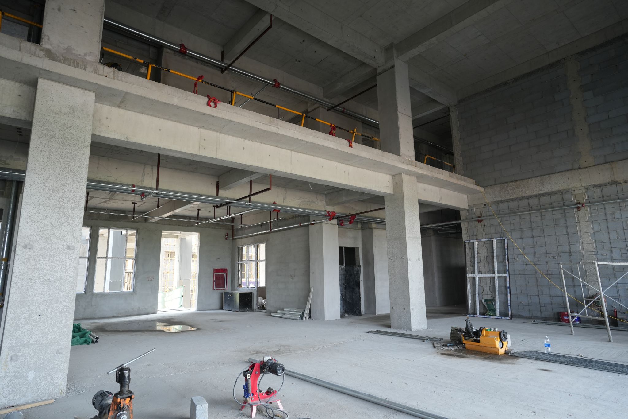 A3-2#楼一层砌筑墙体,二层绑扎柱子钢筋,北连廊三层测量放线,绑扎柱子钢筋,搭设支撑架体;A3-3#一层浇筑构造柱,二层绑扎柱子钢筋。