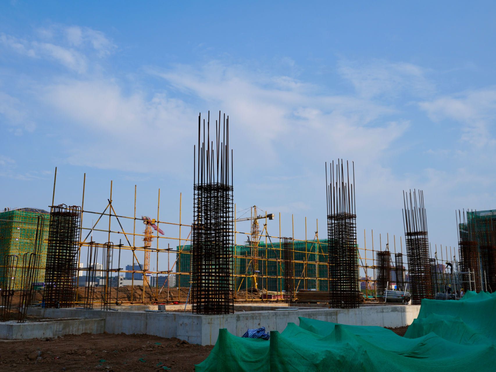 学生宿舍A区宿舍楼已经封顶,正在进行斜屋面梁筋绑扎;学生浴室一层完成,正在进行2层满堂架搭设。