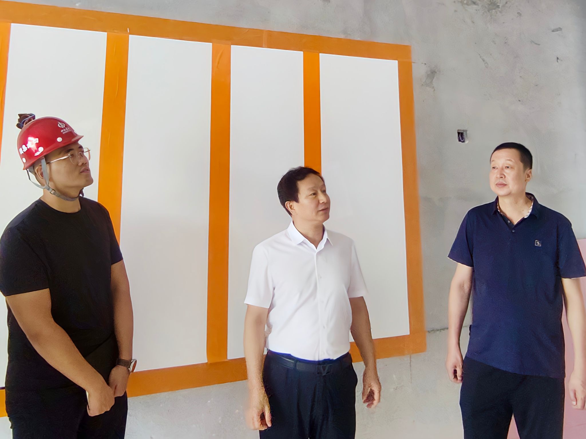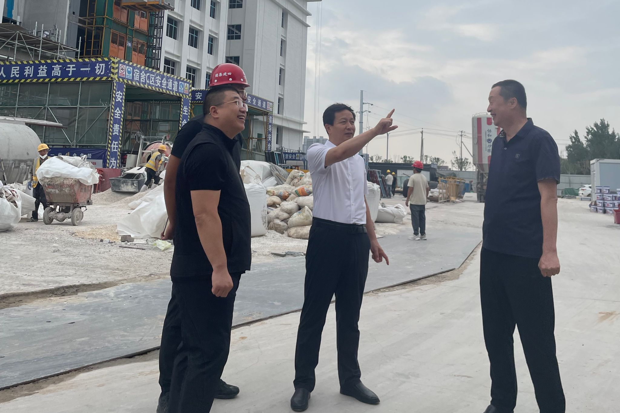 雷承锋深入第一标段、第二标段施工现场仔细查看了产教融合实训楼和学生宿舍装饰装修、操场看台及各楼座外立面施工工艺等,每到一处他都驻足询问了解工程推进情况,并提出明确的要求。