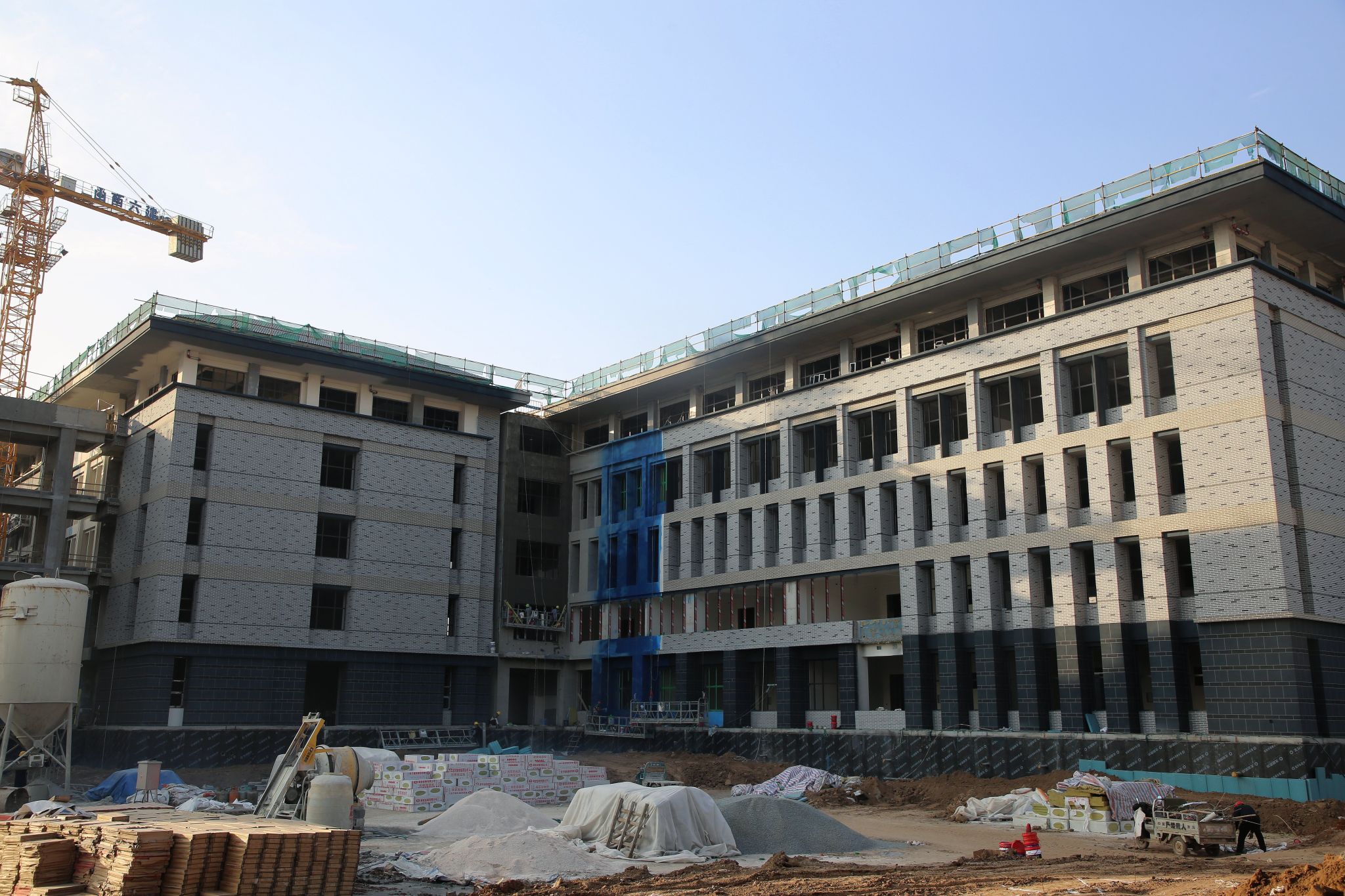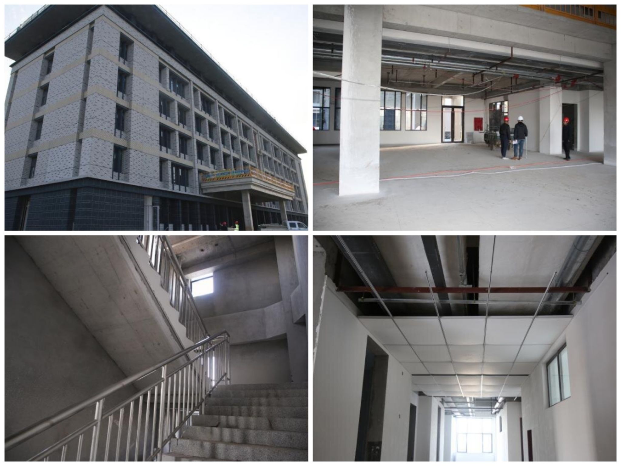 学生宿舍B区B1#楼、B2#楼、B3#楼二次结构屋面砌砖,二次结构六层造柱浇筑,二层水磨石地面施工,四层抹灰施工,五层窗框安装,平屋面防水施工,外墙保温施工;B4#楼、B5#楼楼梯间水磨石打磨,外墙真石漆施工。