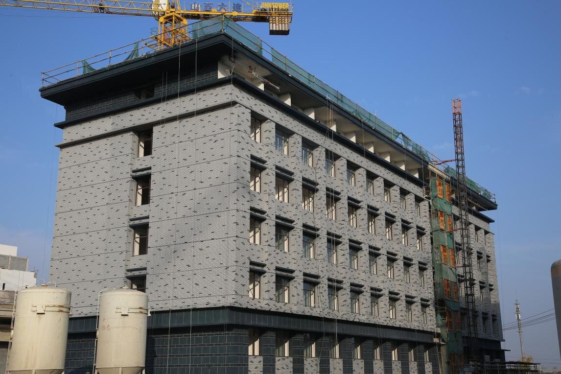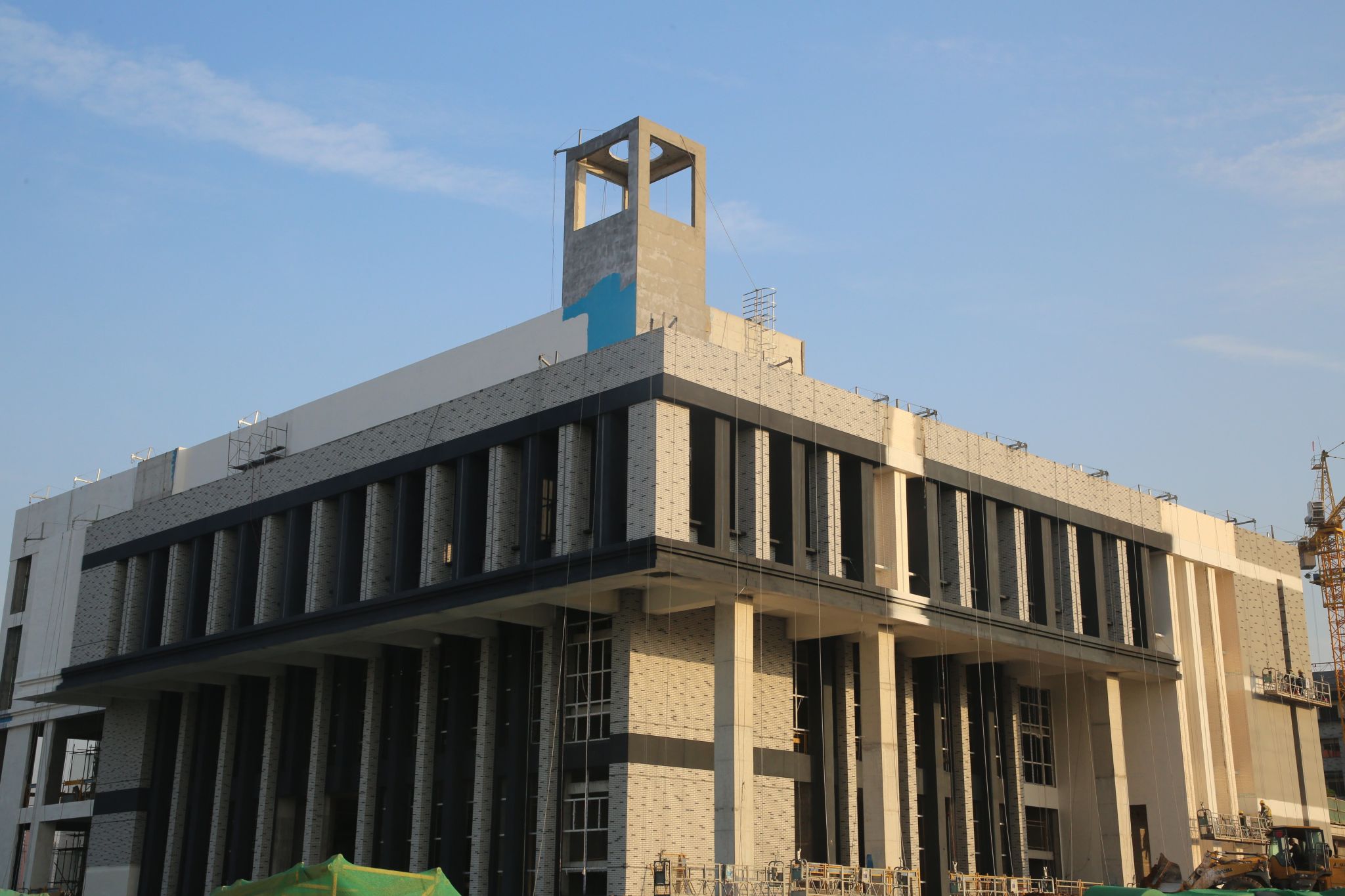 产教融合实训楼A1#楼真石漆施工、屋面分割条施工。