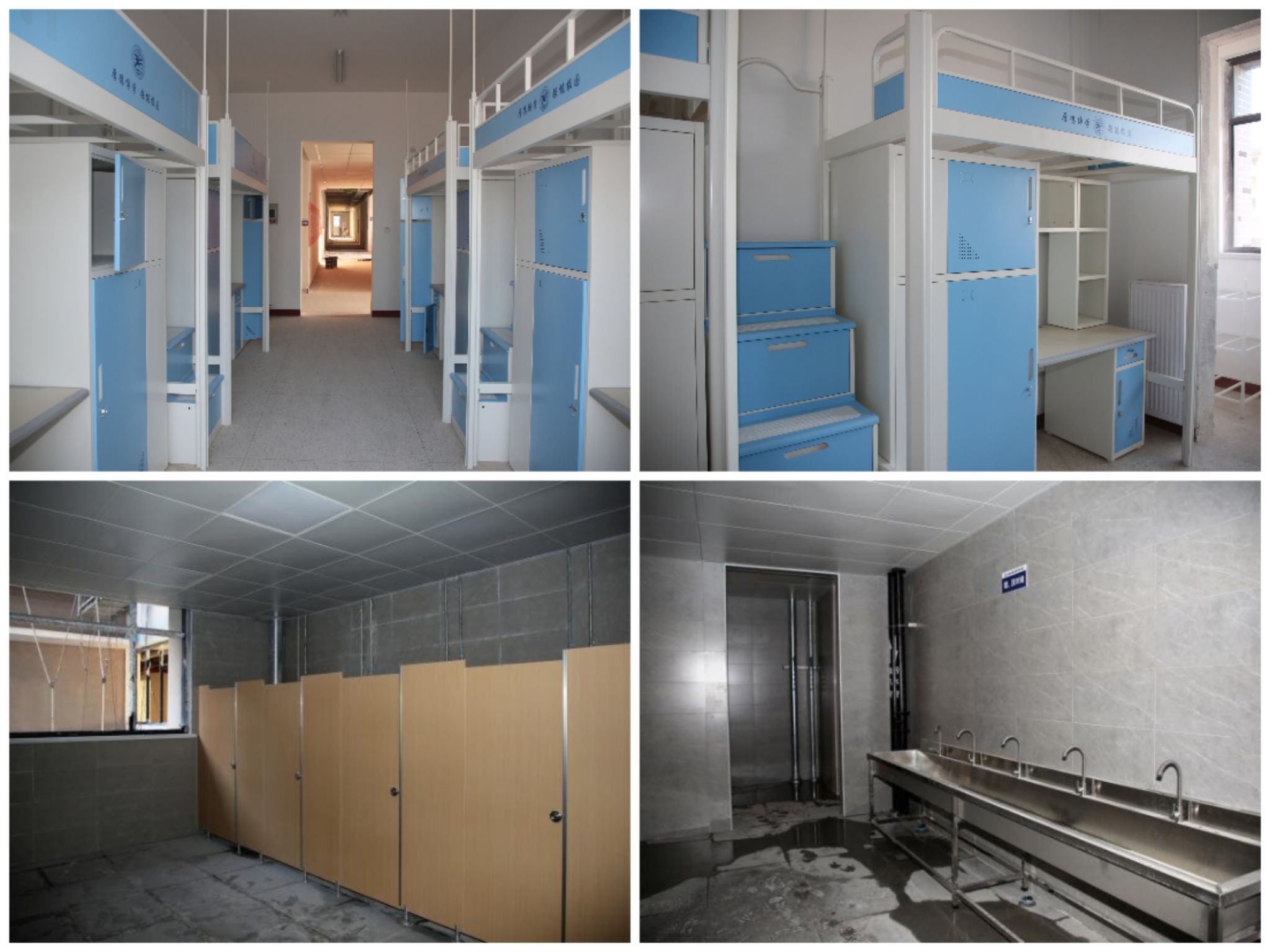 学生宿舍A区宿舍楼斜屋面挂瓦,外墙真石漆施工,六层水磨石地面打磨,楼梯间刮白。