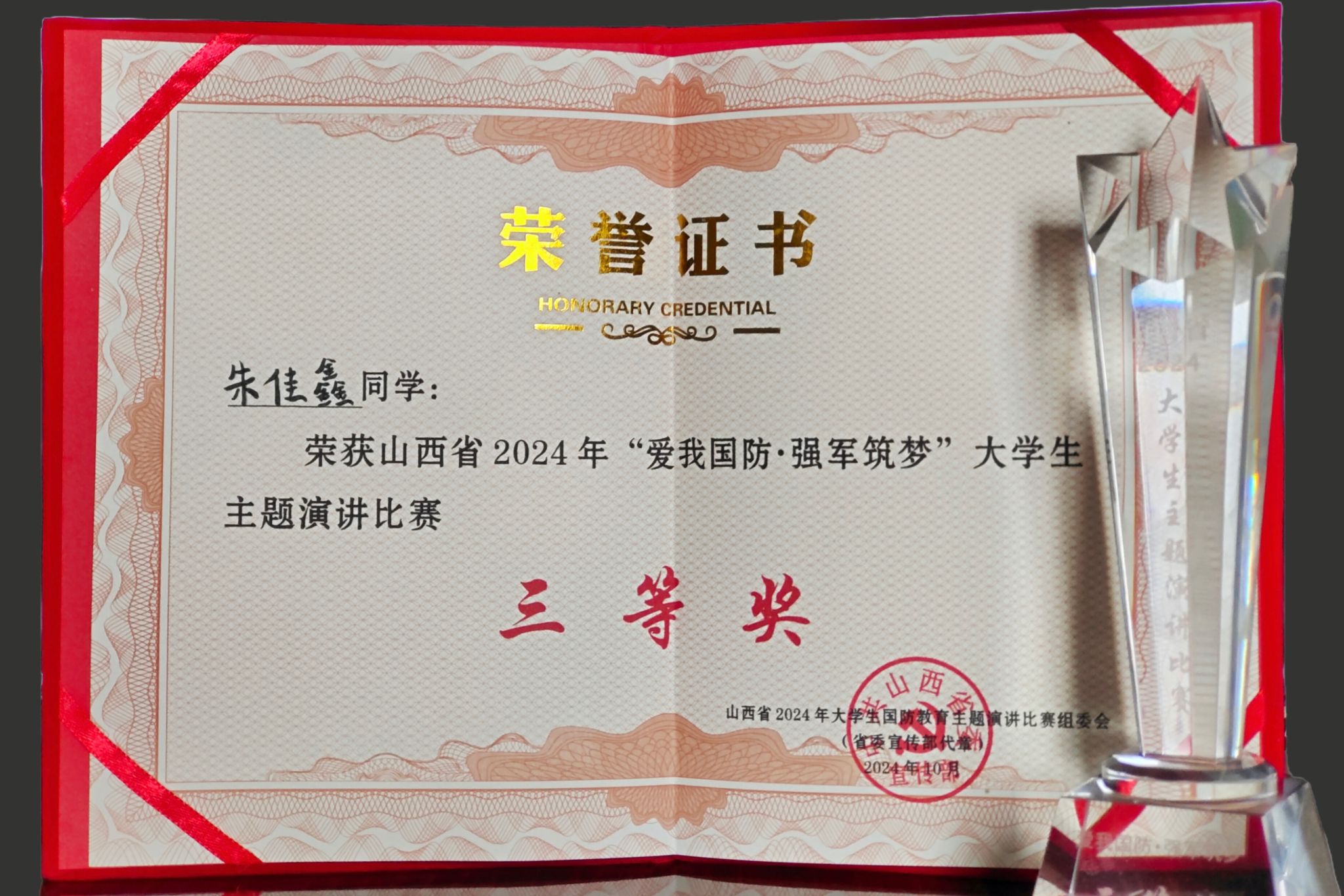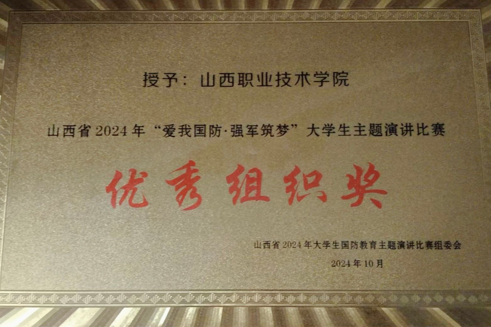 11月1日,由省委宣传部、省教育厅、省军区政治工作局联合主办,山西广播电视台、太原理工大学共同承办的山西省2024年“爱我国防·强军筑梦”大学生主题演讲比赛颁奖仪式在太原理工大学进行,比赛吸引了全省56所高校107名选手积极参与,15名选手进入决赛,共评出一等奖2名、二等奖5名、三等奖8名。开云官网在此次盛事中荣获优秀组织奖,文化旅游系酒店A2201班学生朱佳鑫更是以出色表现斩获三等奖,为开云官网的荣誉榜再添璀璨一笔。