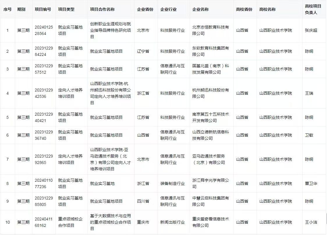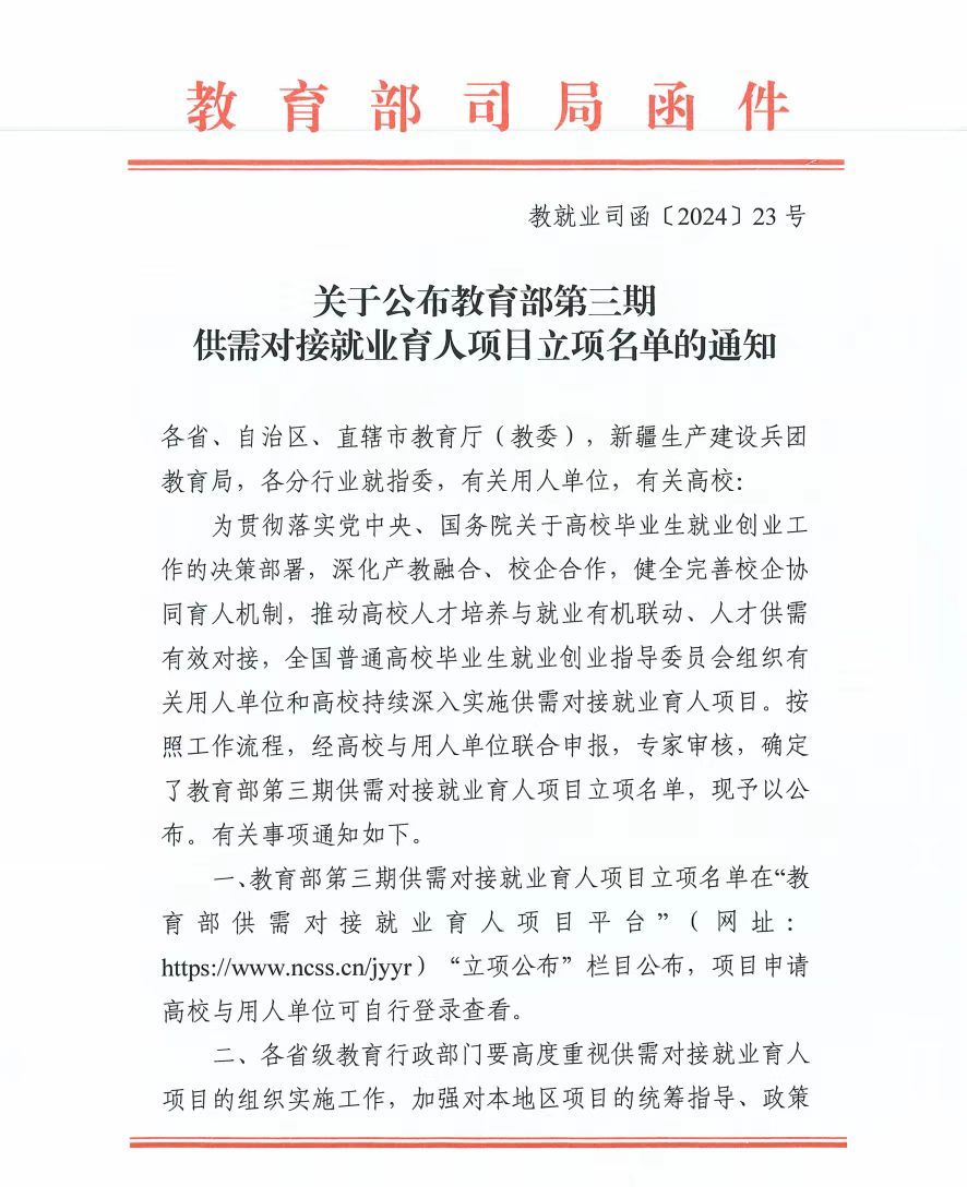 教育部高校学生司(高校毕业生就业服务司)印发《关于公布教育部第三期供需对接就业育人项目立项名单的通知》,公布第三期供需对接就业育人项目立项名单。学院申报的10个项目成功获批教育部第三批供需对接就业育人项目立项。其中就业实习基地项目7个、定向人才培养项目2个、重点领域校企合作项目1个。