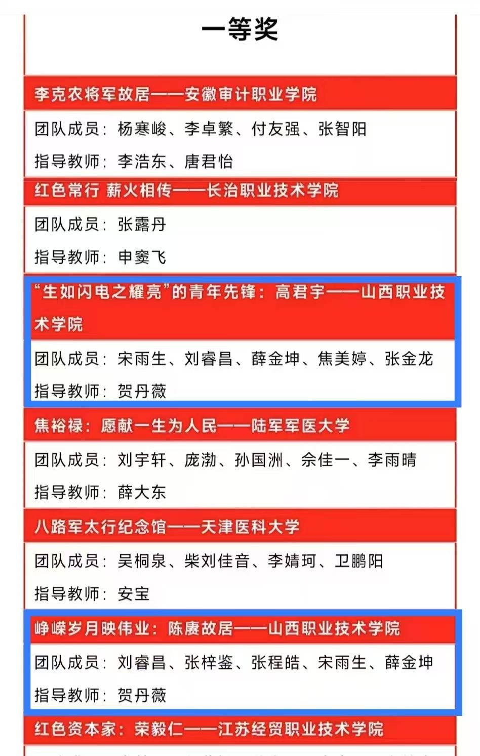本届大赛吸引众多团队参赛,共征集来自24个省(市、自治区)200余所高校提交的700余个作品。经过高校专家评委、博物馆专家评委、社会专家评委、中小学专家评委、资深媒体评委、大学生评委等多轮评审,经历六个多月的层层选拔、网络投票环节,最终开云官网思政部教师贺丹薇带队指导的宋雨生团队和刘睿昌团队分别凭借作品——“‘生如闪电之耀亮’的青年先锋:高君宇”与“峥嵘岁月映伟业:陈赓故居”两部作品,荣获国家一等奖殊荣。这份荣誉的获得离不开学院的高度重视,系部领导的大力支持、以及指导教师、参赛队员们的共同努力。