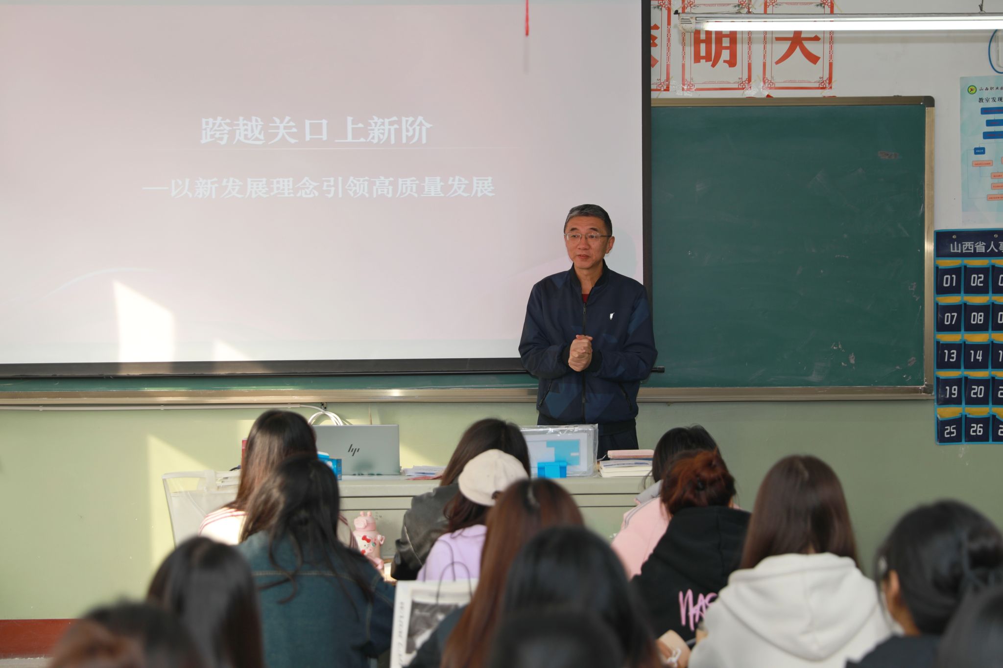 11月 12日,党委副书记、院长何秋生以“学习贯彻党的二十届三中全会精神,以新发展理念引领高质量发展”为主题,以我省转型发展历程为例,启发计应G2301班的同学们深刻认识到,推进中国式现代化,惟有改革,惟有创新,别无选择!激励同学们志存高远,厚植强国有我、技能报国的家国情怀;知行合一,永葆勤学善思、自强不息的进取精神;热爱生活,积蓄博学笃行、充满活力的青春能量。