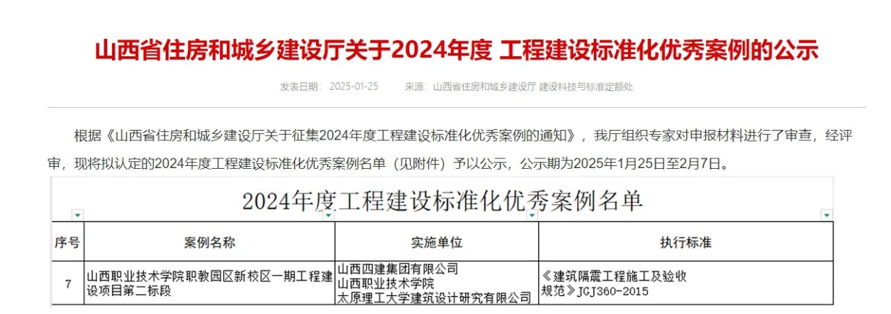 近日,山西省住房和城乡建设厅2024年度工程建设标准化优秀案例评选结果揭晓,学院新校区一期工程第二标段凭借创新性的抗震技术应用,在众多参选项目中脱颖而出,成功入选2024年度工程建设标准化优秀案例。