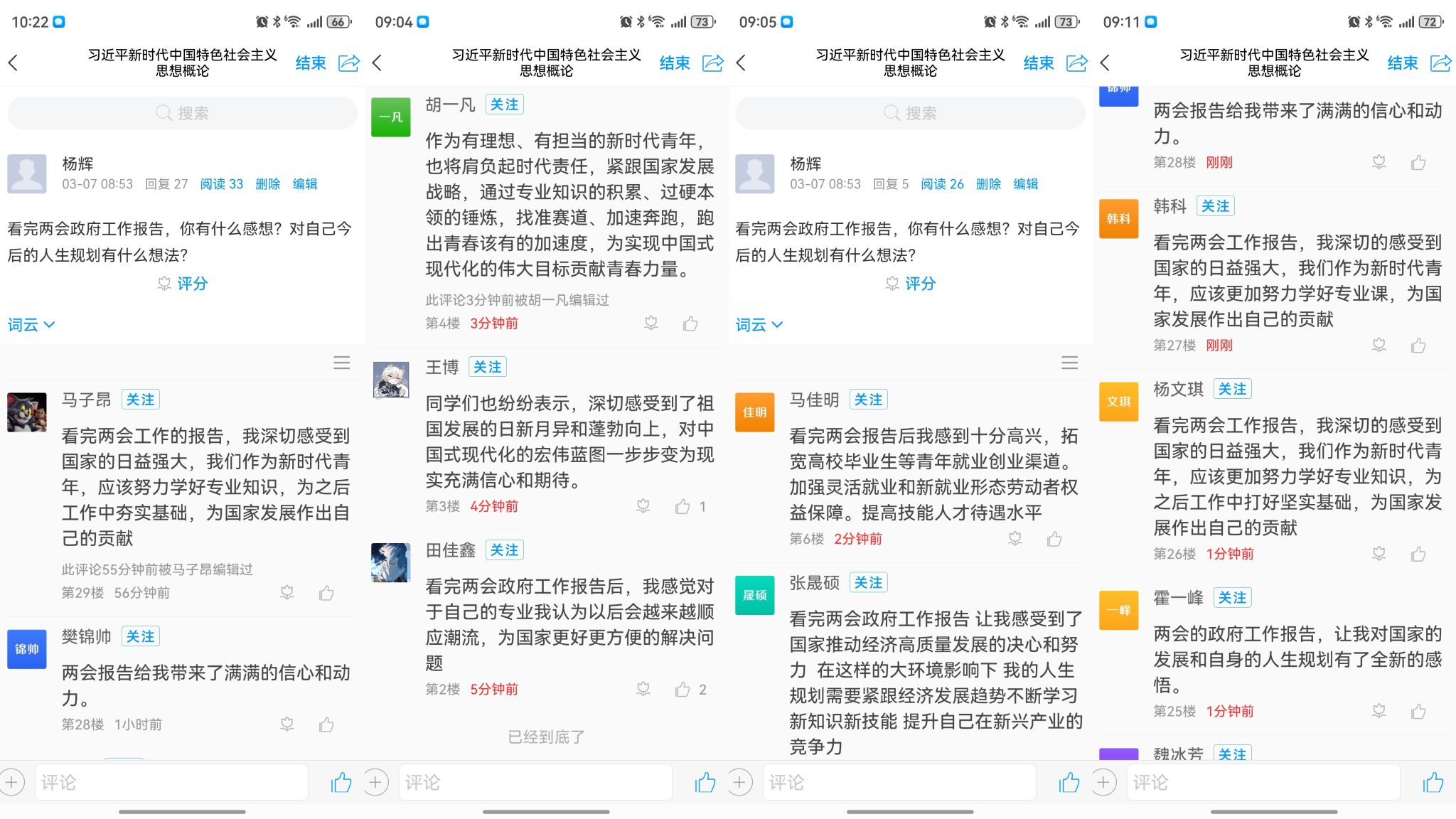 课后,同学们通过学习通作业、主题讨论分享等形式,深切表达了感受祖国发展的日新月异和蓬勃向上,对中国式现代化的宏伟蓝图一步步变为现实充满信心和期待。作为有理想、有担当的新时代青年,也将肩负起时代责任,紧跟国家发展战略,通过专业知识的积累、过硬本领的锤炼,找准赛道、加速奔跑,跑出青春该有的加速度,为实现中国式现代化的伟大目标贡献青春力量。