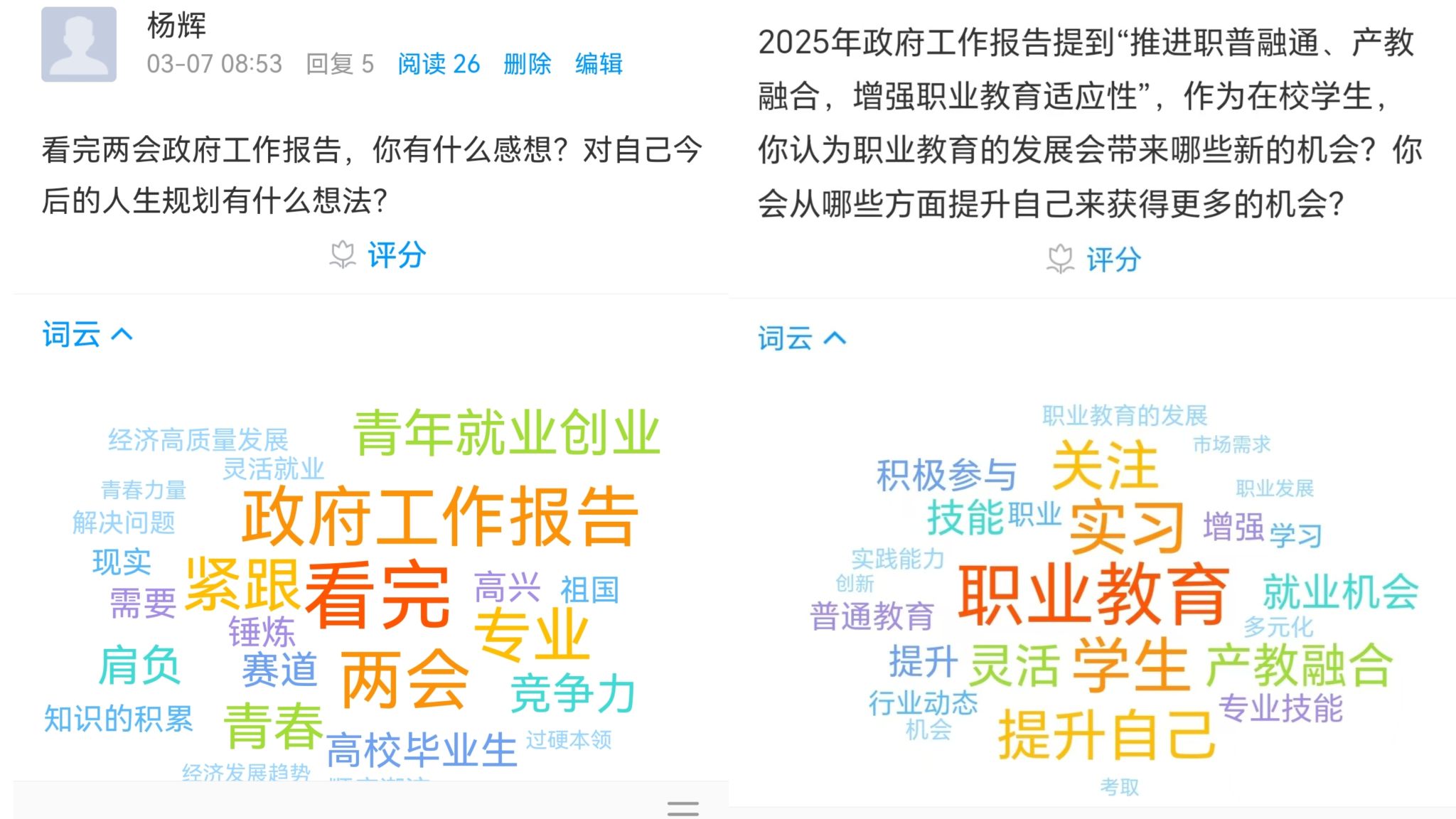 部分同学也积极走上讲台,讨论两会热词,表达自己的所感所想。两会不仅是国家政治生活的大事,关乎每个人生活的风向标,也是青年群体表达期待、凝聚共识的重要窗口。大家一致表示,对2024年经济社会发展取得的成果倍感振奋,对2025年经济社会发展充满期待,决心为建设社会主义现代化强国、建设教育强国努力奋斗。