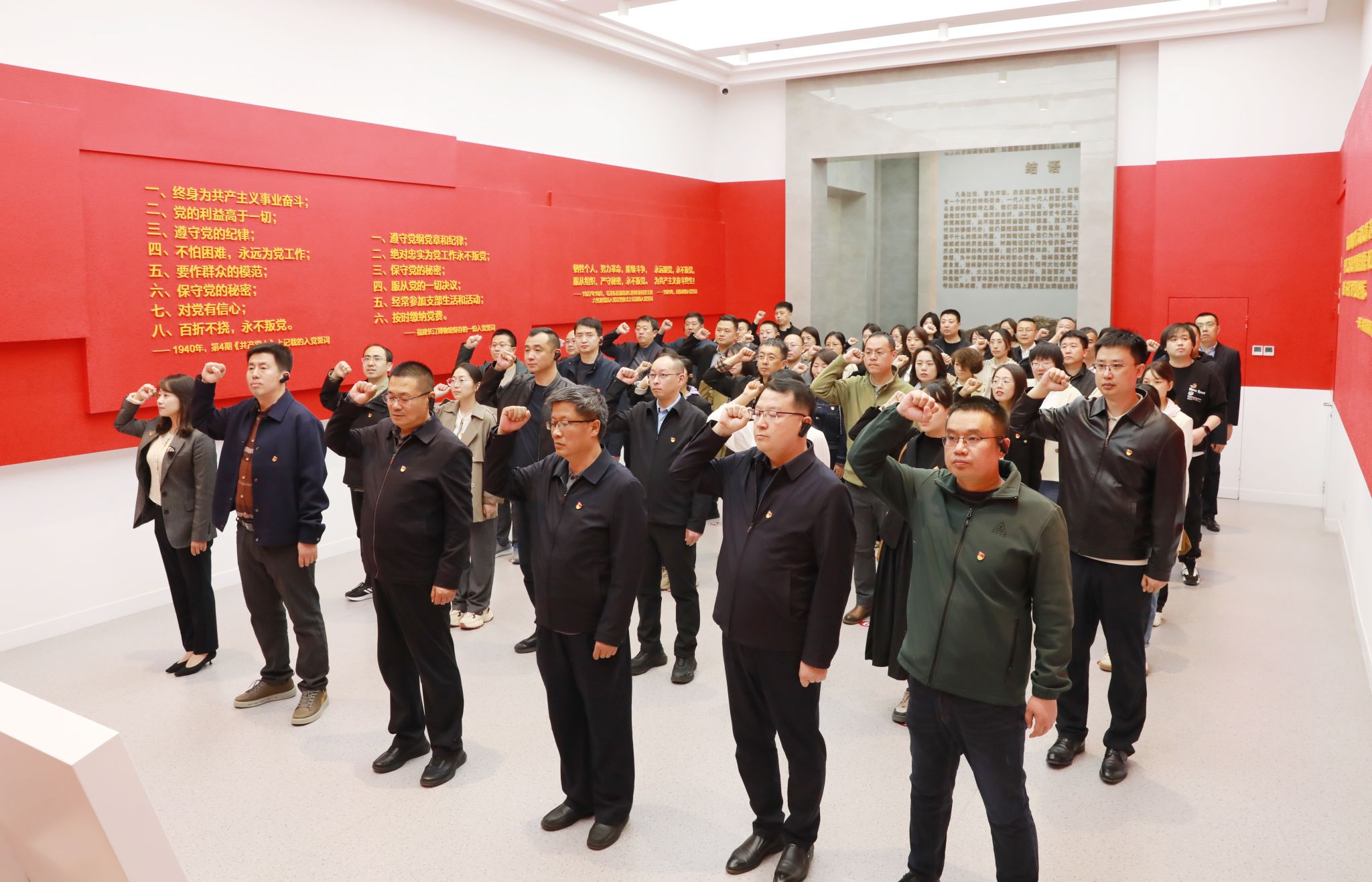 在宣誓厅,全体同志面对党旗,重温入党誓词,铮铮誓言激励大家牢记党的宗旨、永葆共产党人政治本色。