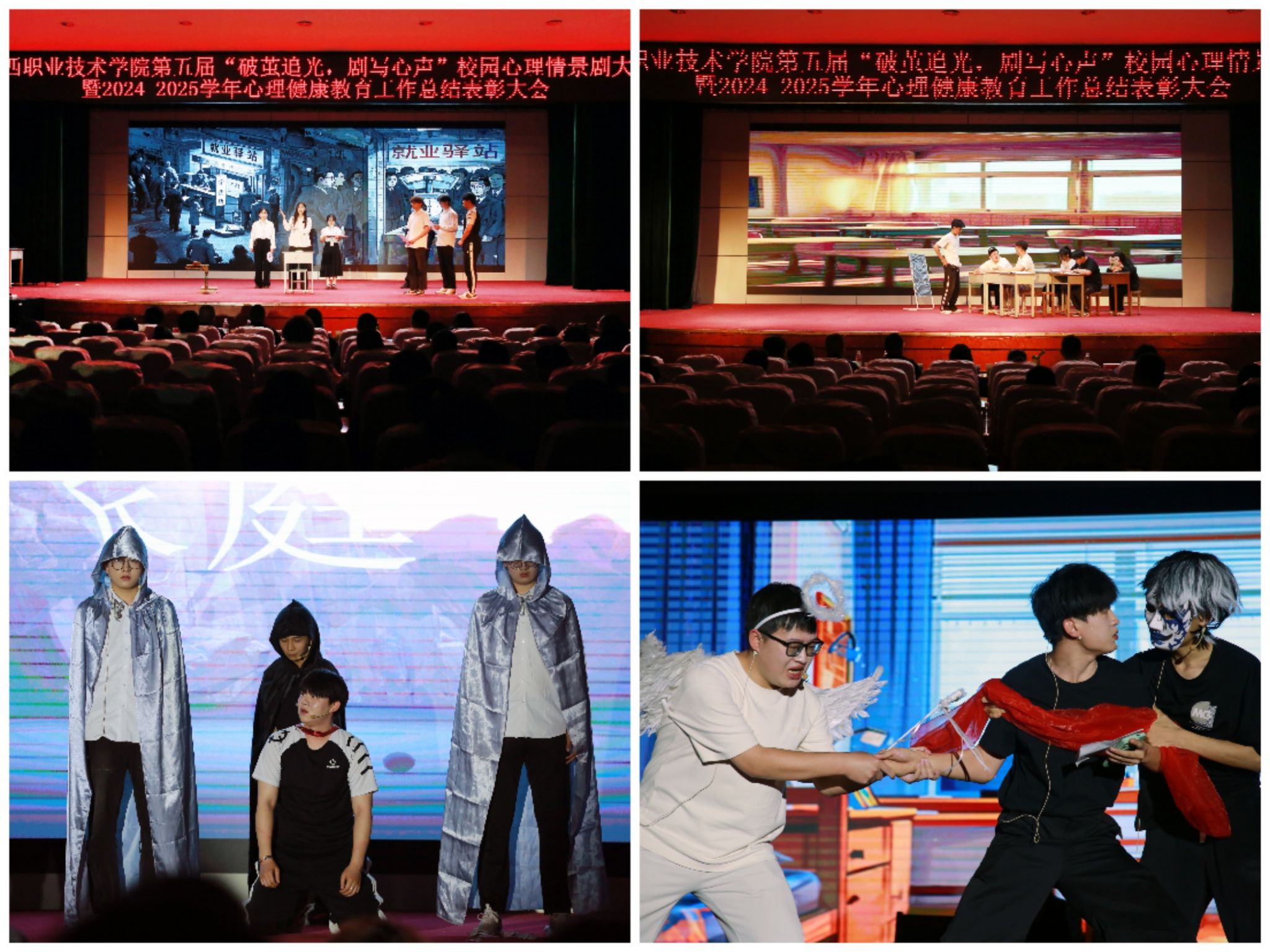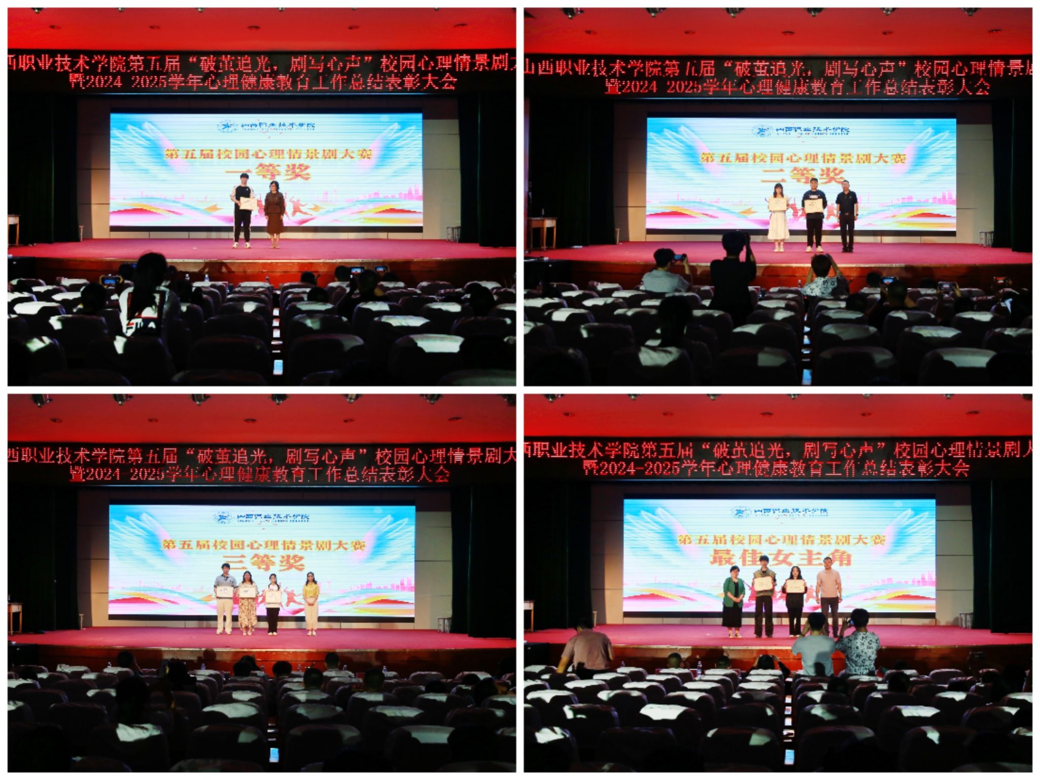 心理情景剧大赛自4月启动以来,得到了全院各系部及相关部门的大力支持。赛事采用初赛视频评审与决赛现场演出有机结合的方式,经过层层选拔和激烈角逐,最终有6支优秀团队成功晋级决赛。经专业评审团综合评定:文博艺术系《抉择·逐光》获得本次大赛一等奖,车辆工程系《创伤的棱镜》和人工智能系《“贷”给我的痛》获得二等奖,建筑工程系《破冰》、艺术设计系《摒弃标签走向光芒》、工商管理系《追梦舞台》获得三等奖;人工智能系高一鸣获得最佳男主角,车辆工程系王亚男获得最佳女主角。