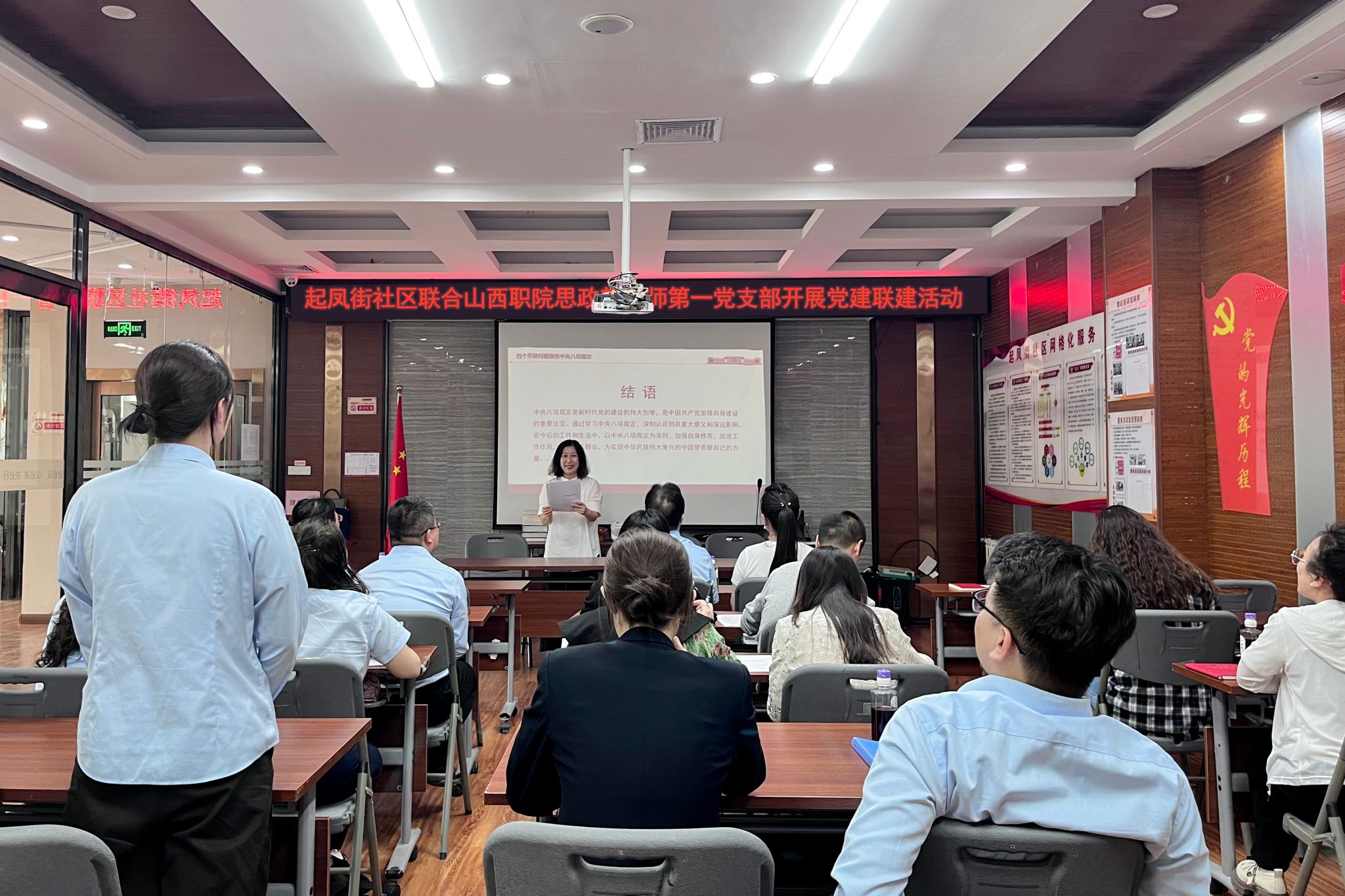 5月13日下午,思政课教师任贤英走进迎泽区起凤街社区,从历史维度出发,以习近平新时代中国特色社会主义思想为指导,为社区的党员干部做了题为《持续推进新时代党的作风建设》的报告,深入学习贯彻习近平总书记关于党的建设的重要思想,落实新时代党的建设总要求和新时代党的组织路线。社区党员进行了深入研讨,意识到党的作风建设任重道远,必须时刻保持警惕。