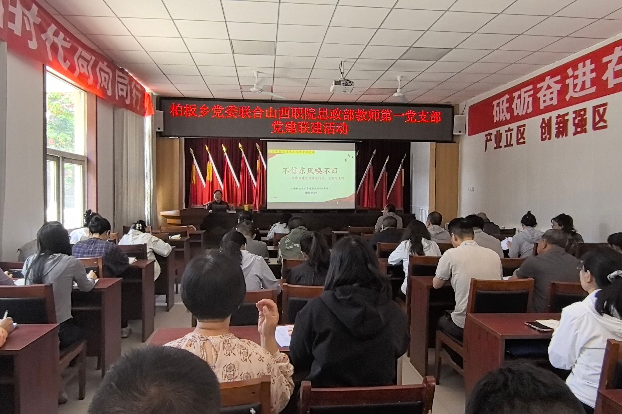 5月27日上午,思想政治理论教学研究部党总支书记蒋晋红在尖草坪区柏板乡人民政府报告厅,以《不信东风唤不回——抓作风建设只有进行时,没有完成时》为题,开展了党的作风建设的理论宣讲。蒋晋红老师从“怎么看”和“怎么办”两个角度切入,采用大量丰富详实的案例,深入浅出的讲明了为什么党中央八项规定入手抓党的作风建设、诠释了中国共产党为了谁?依靠谁?我是谁?的崇高价值取向。年轻党员干部们纷纷表示,作为基层国家行政机关的工作人员,把落实党的作风建设融入日常抓在经常,更好的提升服务群众的能力。