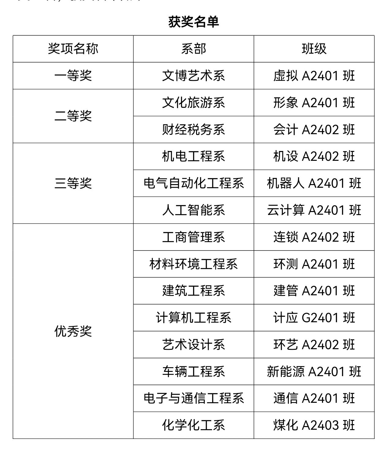 本次活动邀请学院学工部教师组成评审团,从班级特色、成果展示、现场表现等维度进行综合评分。经过三个小时的激烈角逐,最终评选出一等奖1名、二等奖2名、三等奖3名及优秀奖8名,获奖名单如下: