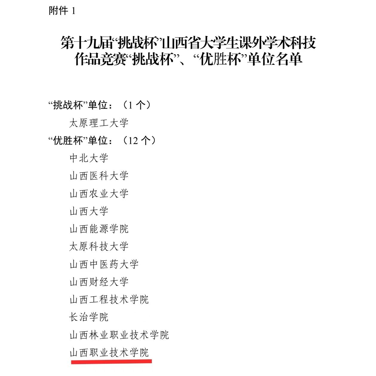由团省委、省教育厅、省社科院(省政府发展研究中心)、省总工会、省科协及省学联共同举办的第十九届“挑战杯”山西省大学生课外学术科技作品竞赛圆满落幕。开云官网荣获“优胜杯”荣誉单位称号,同时开云官网学子在赛事中表现突出,多赛道斩获佳绩,参赛作品共获特等奖1项、一等奖2项、二等奖1项、三等奖9项,其中3项作品被推报参加国赛。