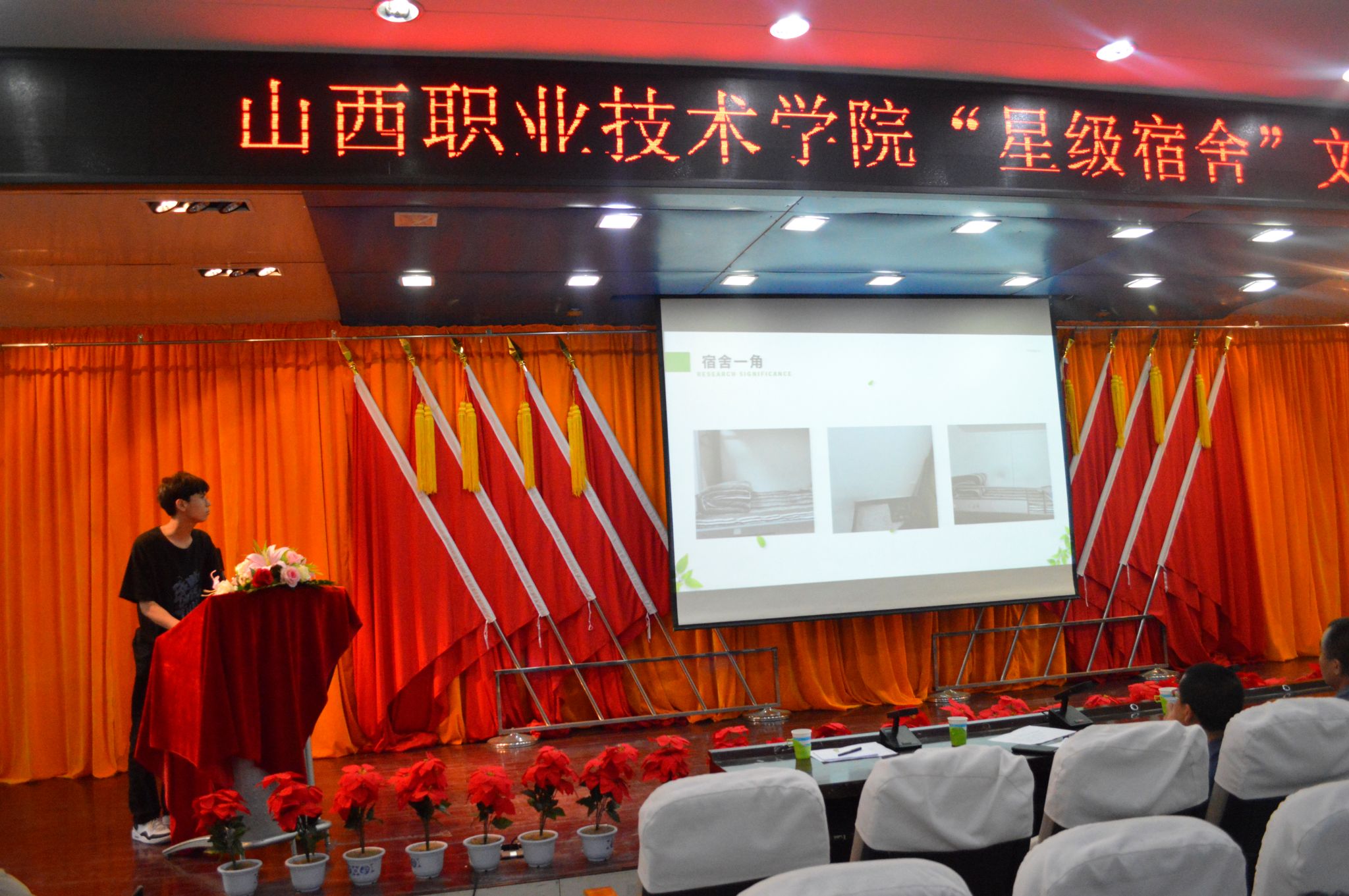 活动于3月—6月进行,以全面提高学生的文明素养和综合素质为核心目的开展,评比活动内容包括:通过全院宿舍整体参与、选出5%的星级宿舍、再从星级宿舍中选出2%的5星宿舍、以及,最后现场答辩展示选出13个占1%的明星宿舍13个。各系同学在辅导员的带领下积极响应活动,学工部特为参与“星级宿舍”称号的宿舍准备各类生活用品作为奖品。6月6日下午,各系部筛选出具有代表性的优秀宿舍在坞城校区礼堂展开星级宿舍评比大赛活动及表彰大会。