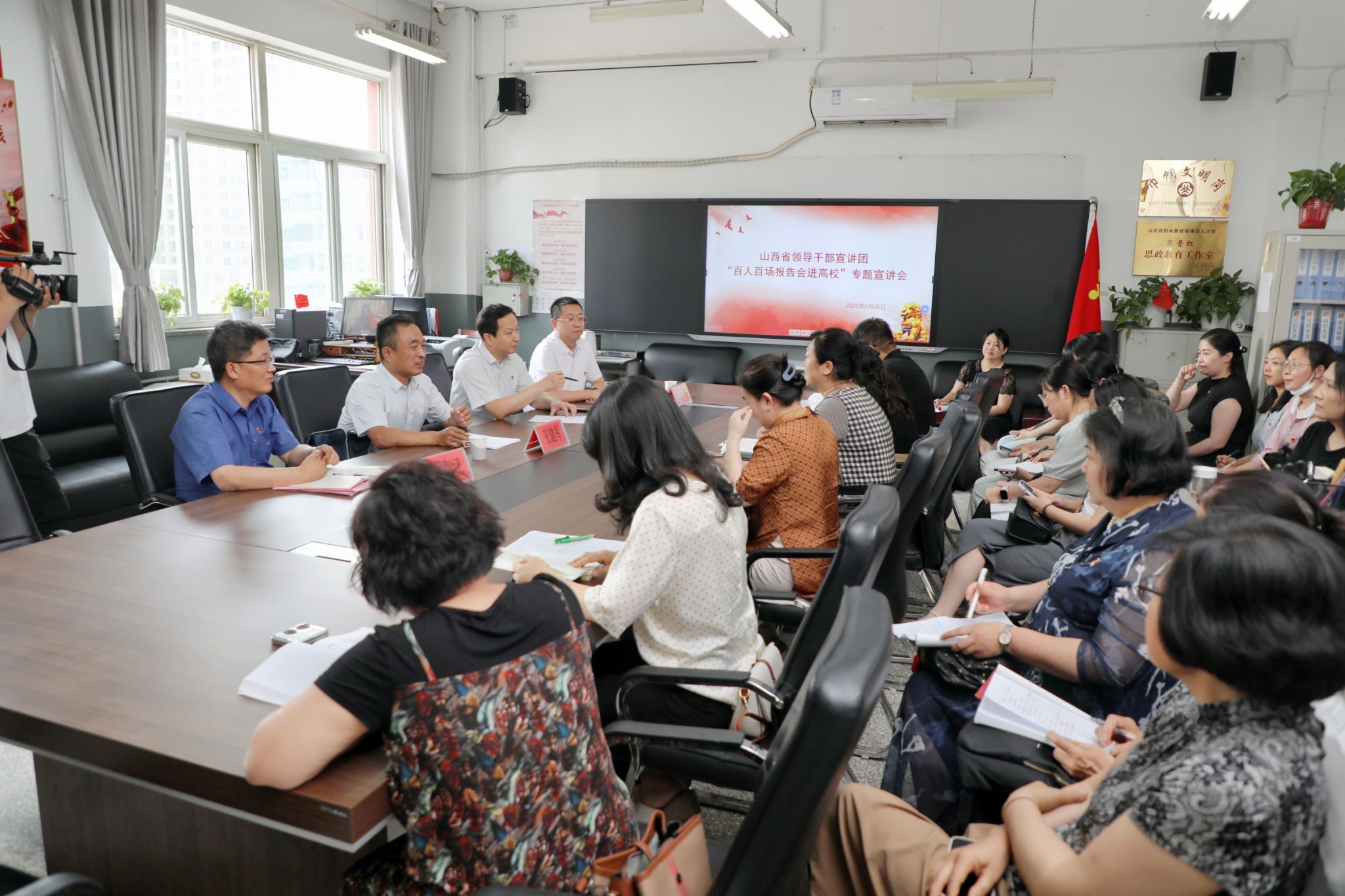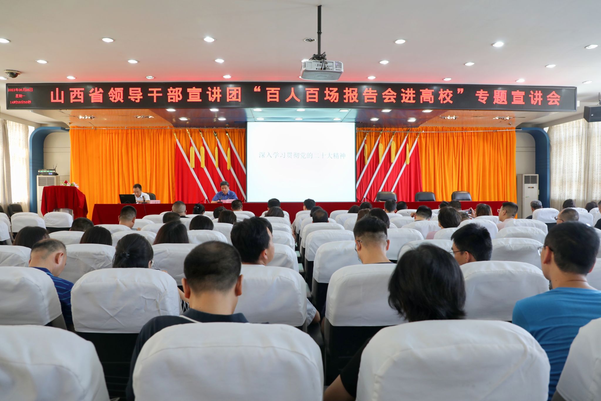 6月26日下午,山西省领导干部宣讲团“百人百场报告会进高校”专题宣讲报告会在开云官网坞城校区七楼会议室举行,省委党校(山西行政学院)副校(院)长王建军教授应邀作宣讲报告。党委书记雷承锋、纪委书记牛惠斌等学院领导班子成员,全院副科级以上领导干部、各党总支书记、党支部书记、专职组织员及学生代表共同聆听了报告。报告会由党委副书记尤陶江主持。