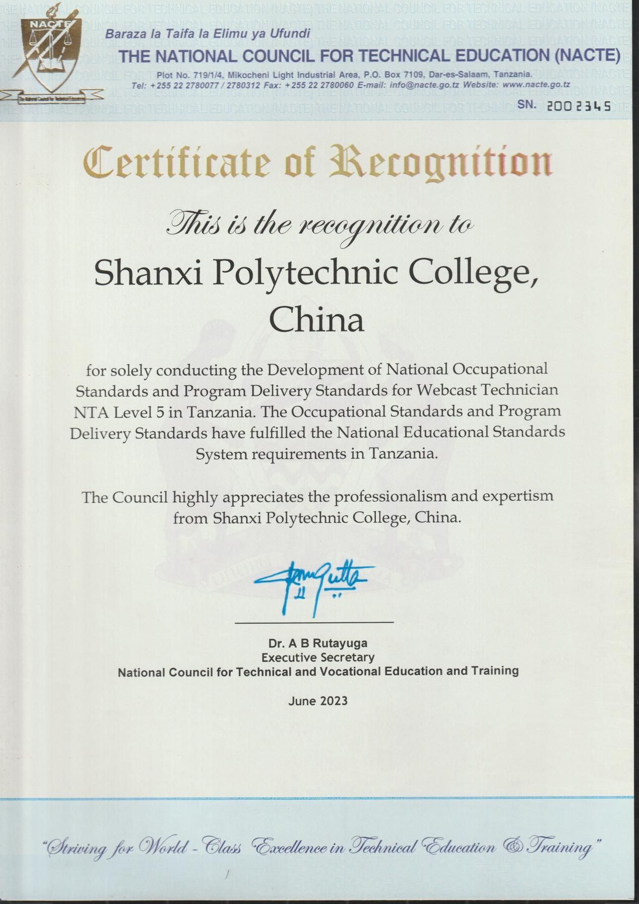 坦桑尼亚国家职业标准项目经申报、专家评审和在线答辩等环节,于2022年11月正式立项启动,依托学院工商管理系双师师资团队、深入的产教融合机制、创新的人才培养模式,与坦桑尼亚教育部国家职业教育委员会专家组织召开了多次工作会议进行深入研讨,通过深入的调研与比对,结合坦桑尼亚实际现状与需求,开发了网络直播技术员NTA5级的国家职业标准、配套的专业教学标准等,最终顺利通过坦桑尼亚教育部国家职业教育委员会注册认证并获得官方认证证书,正式纳入坦桑尼亚国家职业教育体系。
