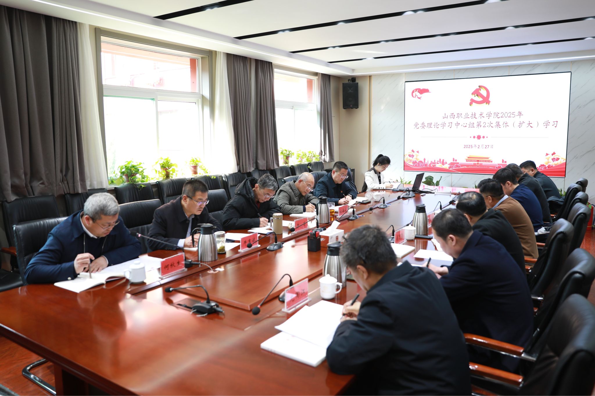 会议要求,全体参会人员要持续学习《习近平总书记关于党的建设的重要思想概论》;学习《教育强国建设规划纲要(2024-2035)》;学习山西省教育厅 山西省财政厅关于做好第二期“双高计划”申报工作的通知;学习习近平总书记向第38届非洲联盟峰会致贺电精神;学习习近平总书记在《求是》杂志发表重要文章《健全全面从严治党体系》《注重家庭,注重家教,注重家风》《进一步全面深化改革中的几个重大理论和实践问题》;学习习近平主席在哈尔滨第九届亚洲冬季运动会开幕式欢迎宴会上的重要致辞;学习习近平总书记在二〇二五年春节团拜会上的重要讲话精神;学习中共中央政治局1月20日会议精神;学习习近平总书记对审计工作作出的重要指示精神;学习习近平总书记给国家京剧院青年艺术工作者回信精神;学习习近平总书记向中国法学会第九次全国会员代表大会致信精神;学习《习近平总书记关于加强和改进民族工作的重要思想学习读本》;学习《习近平生态文明思想学习问答》;持续深入学习党的二十届三中全会精神;深入学习习近平总书记考察山西时的系列讲话精神;深化学习习近平总书记在庆祝中国共产党成立100周年大会上的重要讲话精神;研读《习近平新时代中国特色社会主义思想学习问答》《论中国共产党历史》等党史学习教育指定7本书原文、原著;学习党的二十大报告、党的二十大闭幕会重要讲话、中国共产党第二十届中央委员会第一次全体会议公报精神;学习习近平总书记在庆祝中华人民共和国成立75周年招待会上的重要讲话精神;学习2022年10月22日通过的《中国共产党章程》;深化学习《习近平法治思想学习纲要》《习近平经济思想学习纲要》《习近平生态文明思想学习纲要》《习近平谈治国理政》第四卷、《习近平著作选读》(第一卷、第二卷)、学思践悟习近平经济思想丛书(2023);深化学习《中国共产党纪律检查委员会工作条例》和《中华人民共和国监察法实施条例》《关于加强新时代廉洁文化建设的意见》《习近平关于力戒形式主义官僚主义重要论述选编》;深化学习《中国共产党宣传工作简史》《中国共产党宣传工作条例》《习近平关于社会主义精神文明建设论述摘编》《中国式现代化面对面》《学习贯彻习近平总书记在文化传承发展座谈会上的重要讲话精神述评》《深入学习习近平关于科技创新的重要论述》《习近平关于应急管理的重要论述》《习近平关于金融工作论述摘编》《习近平关于全面加强党的纪律建设论述摘编》《习近平关于国家能源安全论述摘编》;深化学习《中华人民共和国国家安全法》《中华人民共和国网络安全法》《中华人民共和国数据安全法》《总体国家安全观学习纲要》《习近平总书记关于网络强国的重要思想概论》《关于贯彻<党委>(党组)国家安全责任制规定》>的实施意见》《维护社会稳定责任制》等;学习习近平新时代中国特色社会主义思想主题教育指定学习资料《习近平新时代中国特色社会主义思想专题摘编》《论党的自我革命》《习近平新时代中国特色社会主义思想的世界观和方法论专题摘编》《习近平关于调查研究论述摘编》。